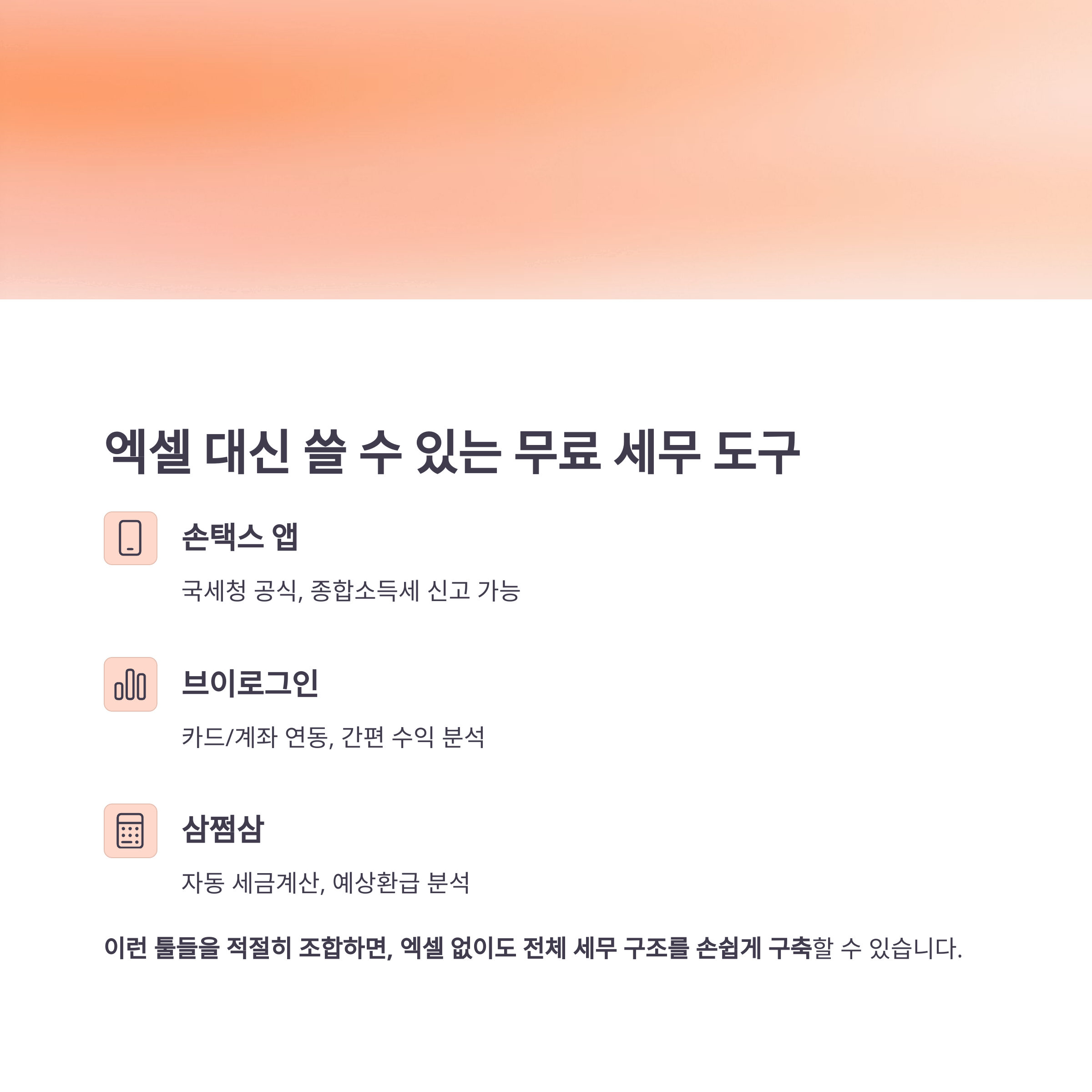 이런 툴들을 적절히 조합하면, 엑셀 없이도 전체 세무 구조를 손쉽게 구축할 수 있습니다.