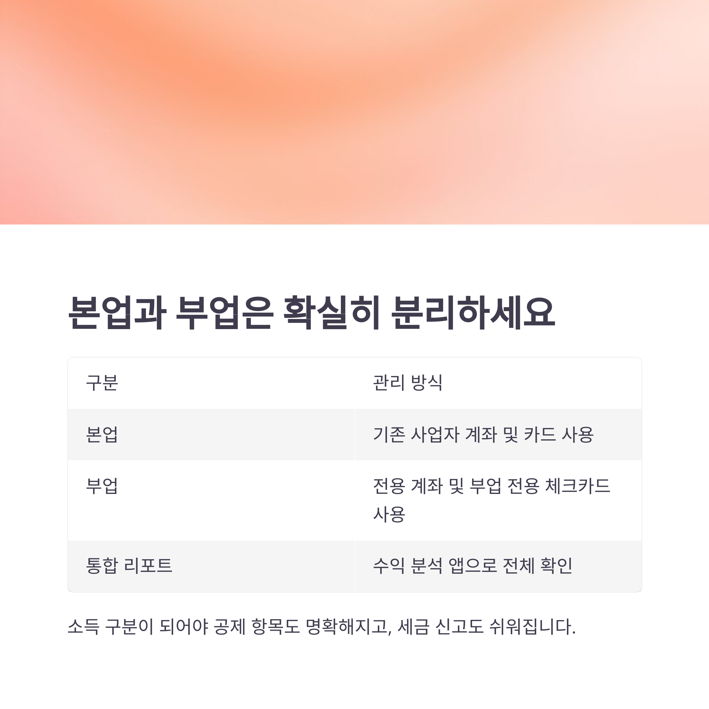 많은 자영업자들이 본업과 부업의 매출·비용을 한 계좌로 섞어 쓰는 실수를 합니다.