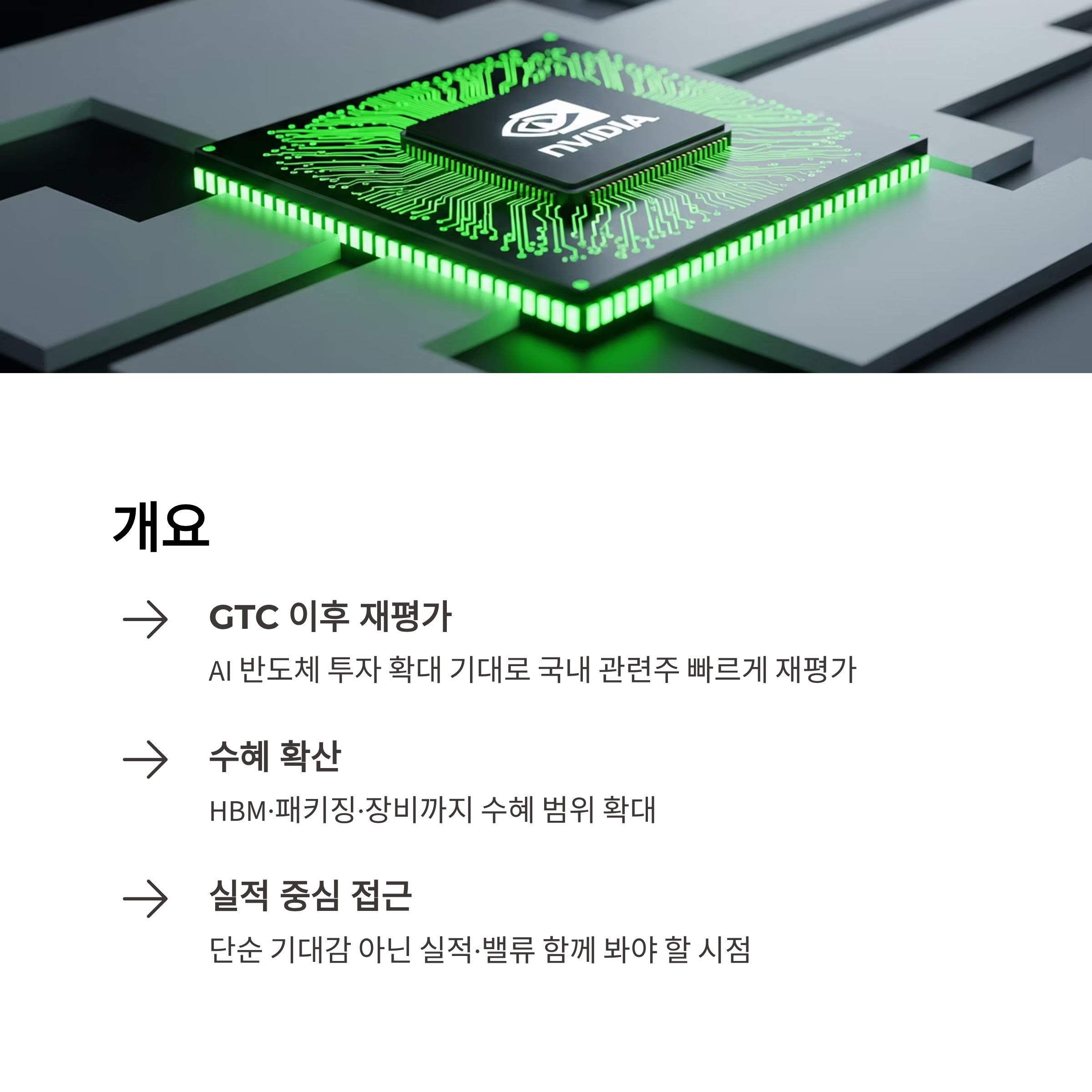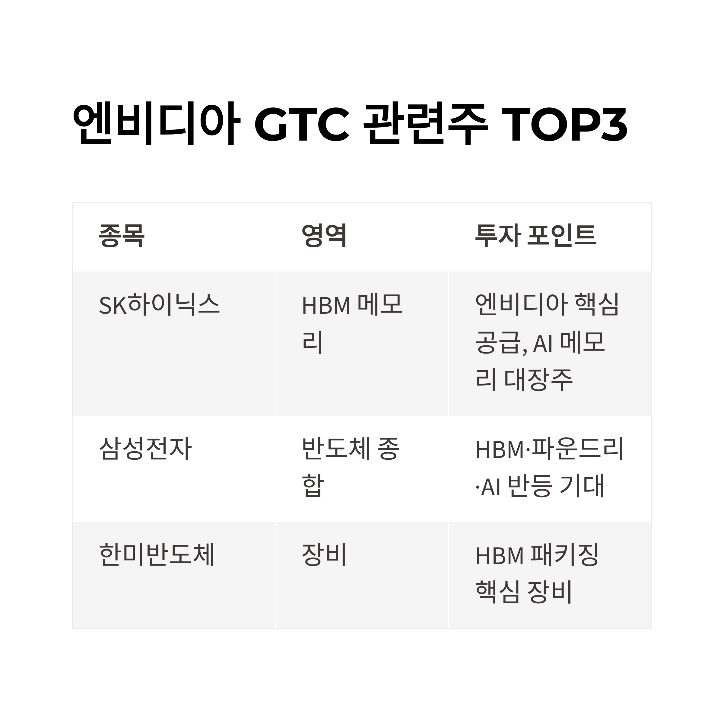 지금 엔비디아 GTC 관련주는 이미 늦은 구간일까요. 최근 NVIDIA GTC 이후 AI 반도체 투자 확대 기대가 다시 한 번 시장을 자극하고 있습니다. 특히 GPU 중심 구조에서 HBM, 패키징, 장비까지 수혜가 확산되면서 국내 관련주들도 빠르게 재평가되고 있습니다. 다만 현재 구간은 단순 기대감이 아니라 실적과 밸류를 같이 봐야 하는 시점입니다. 이번 글에서는 GTC 관련주 TOP3를 중심으로 대장주 구조와 주가 전망, 그리고 지금 투자 전략까지 정리해보겠습니다.