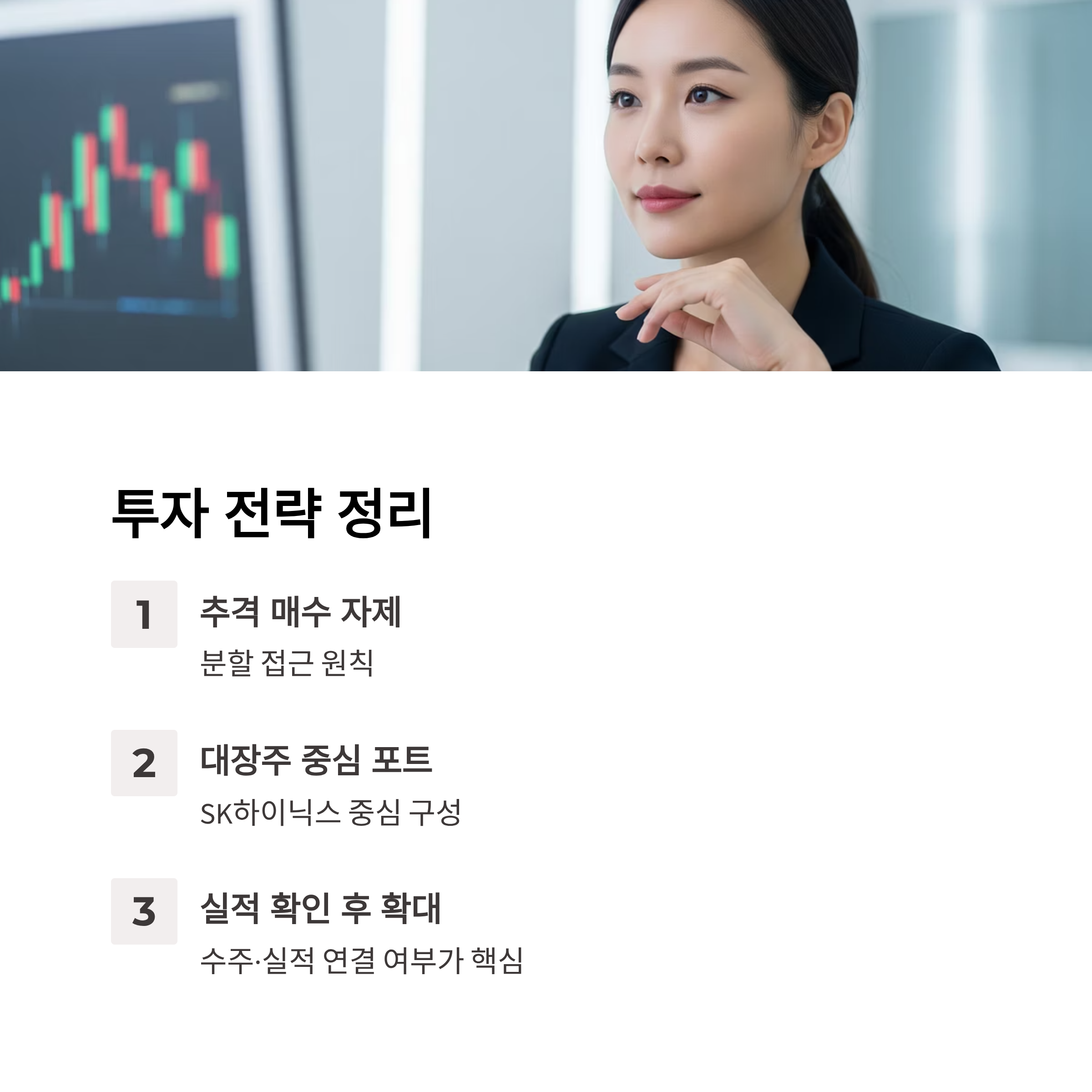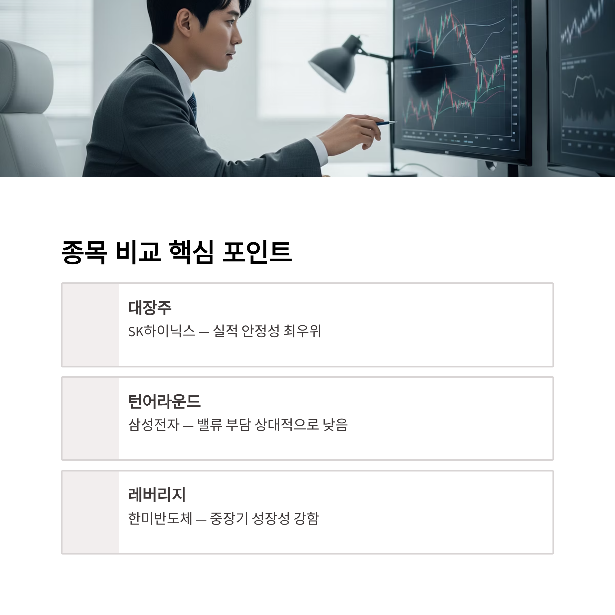 따라서 투자 관점에서는 SK하이닉스 같은 대장주 중심으로 접근하고, 삼성전자와 한미반도체를 보조 축으로 보는 전략이 유효한 구간입니다.