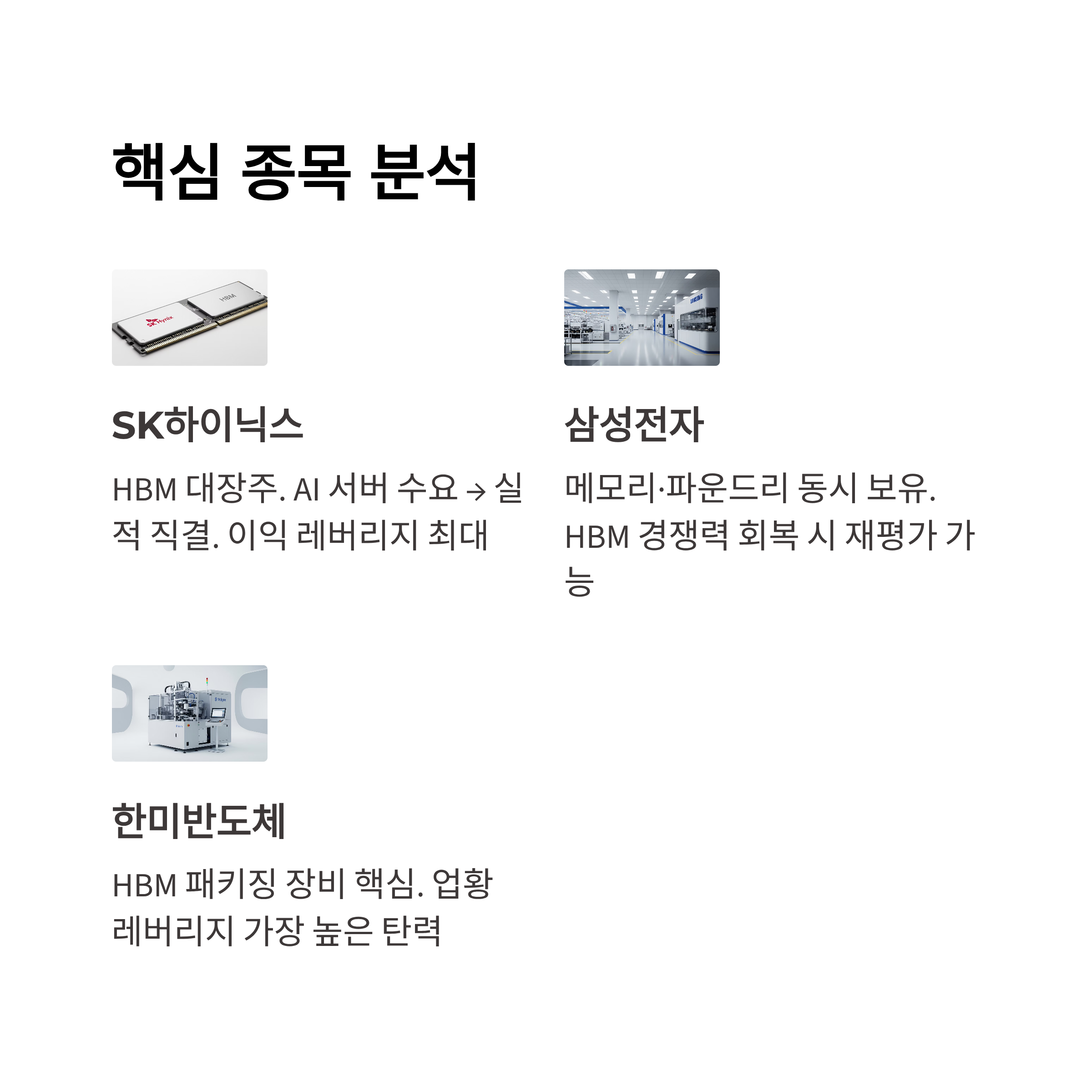| SK hynix | HBM 메모리 | 엔비디아 핵심 공급, AI 메모리 대장주 |