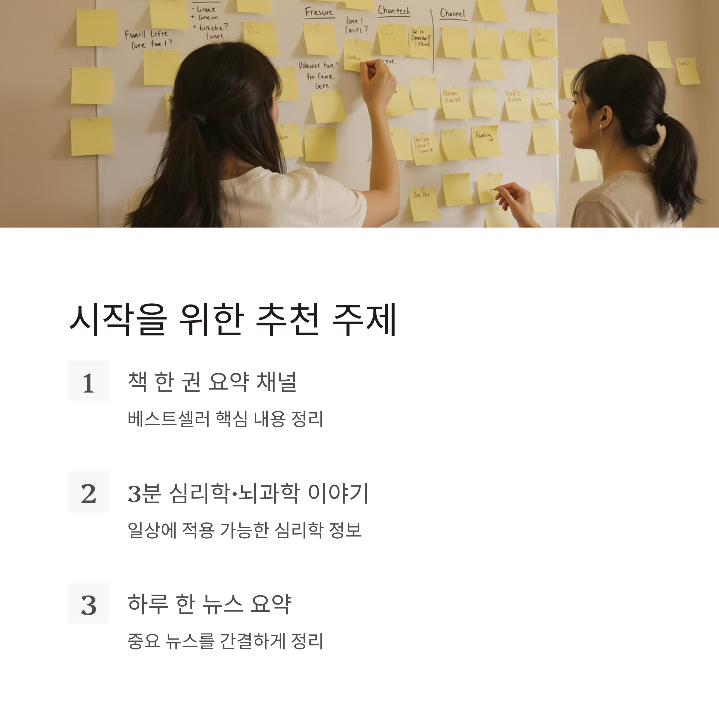 | 스크립트 기반 채널 | 이야기, 괴담, 공부 팁 등 자막 위주 콘텐츠 구성 |