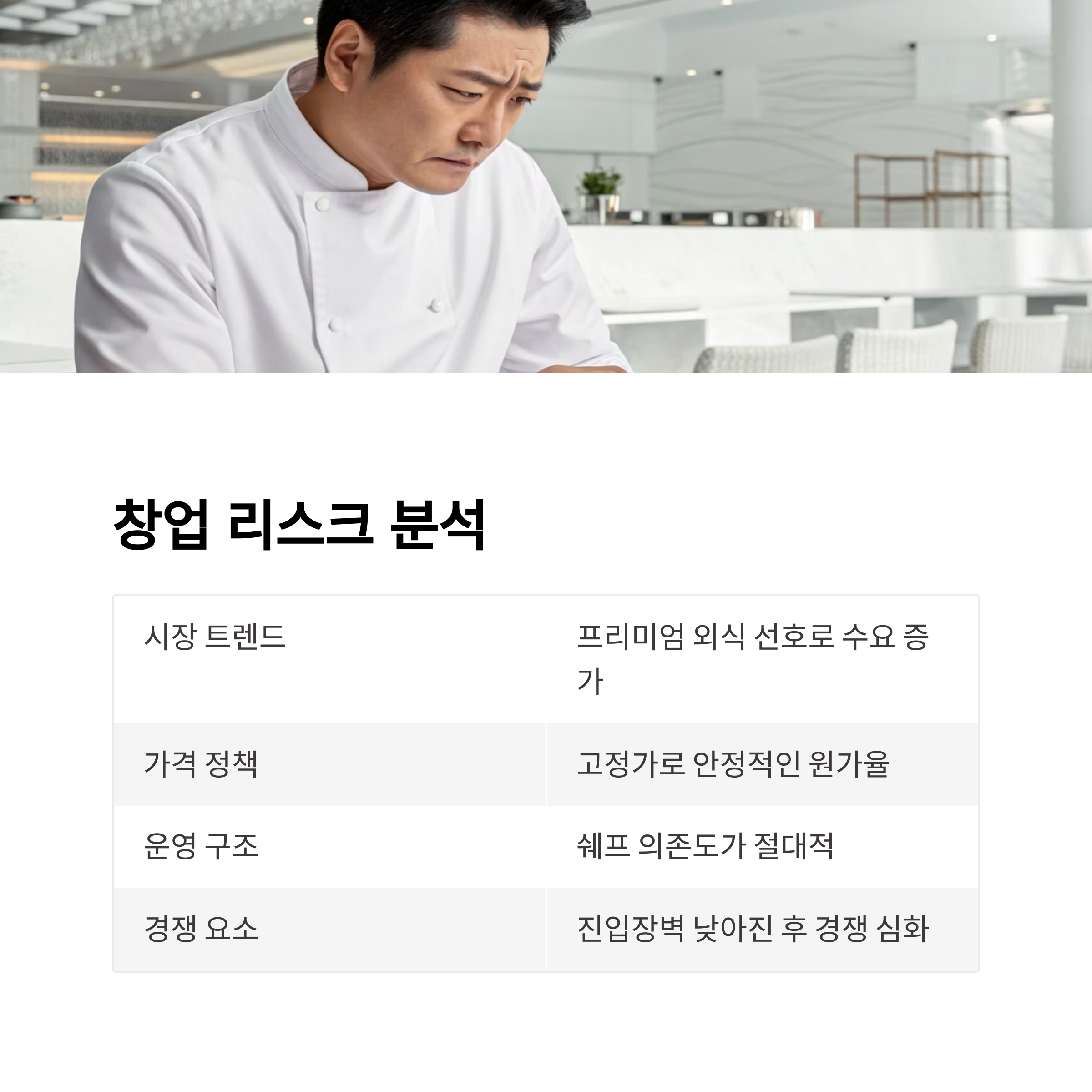 | 운영 구조 | 소규모 인력으로 가능 | 쉐프 의존도가 절대적 |