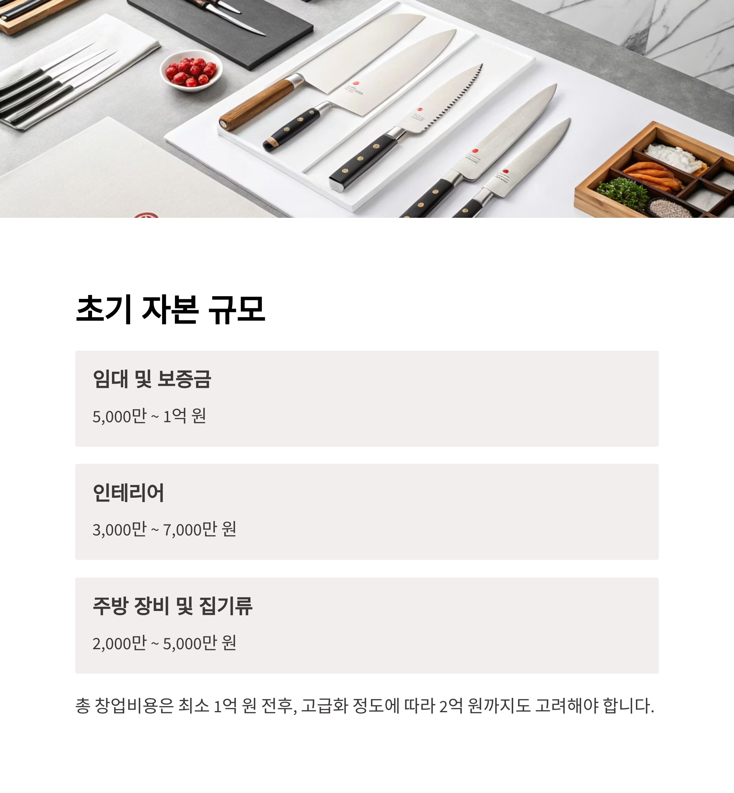 총 창업비용은 최소 1억 원 전후, 고급화 정도에 따라 2억 원까지도 고려해야 합니다.