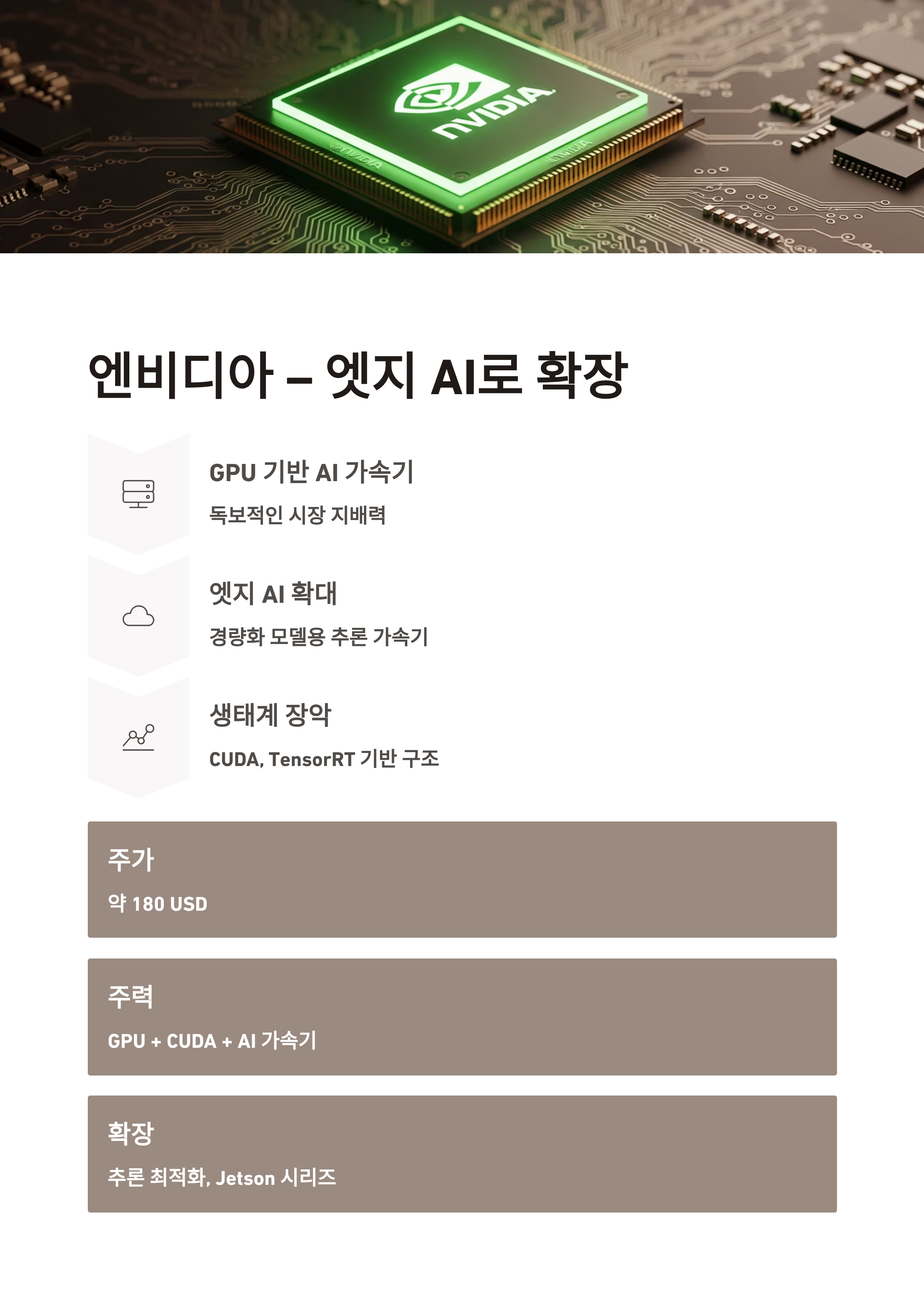 | NVIDIA | 플랫폼 확장형 | 클라우드 + 엣지 AI 모두 커버 | 높은 밸류에이션, 경쟁사 추격, 하드웨어 외부 의존성 |