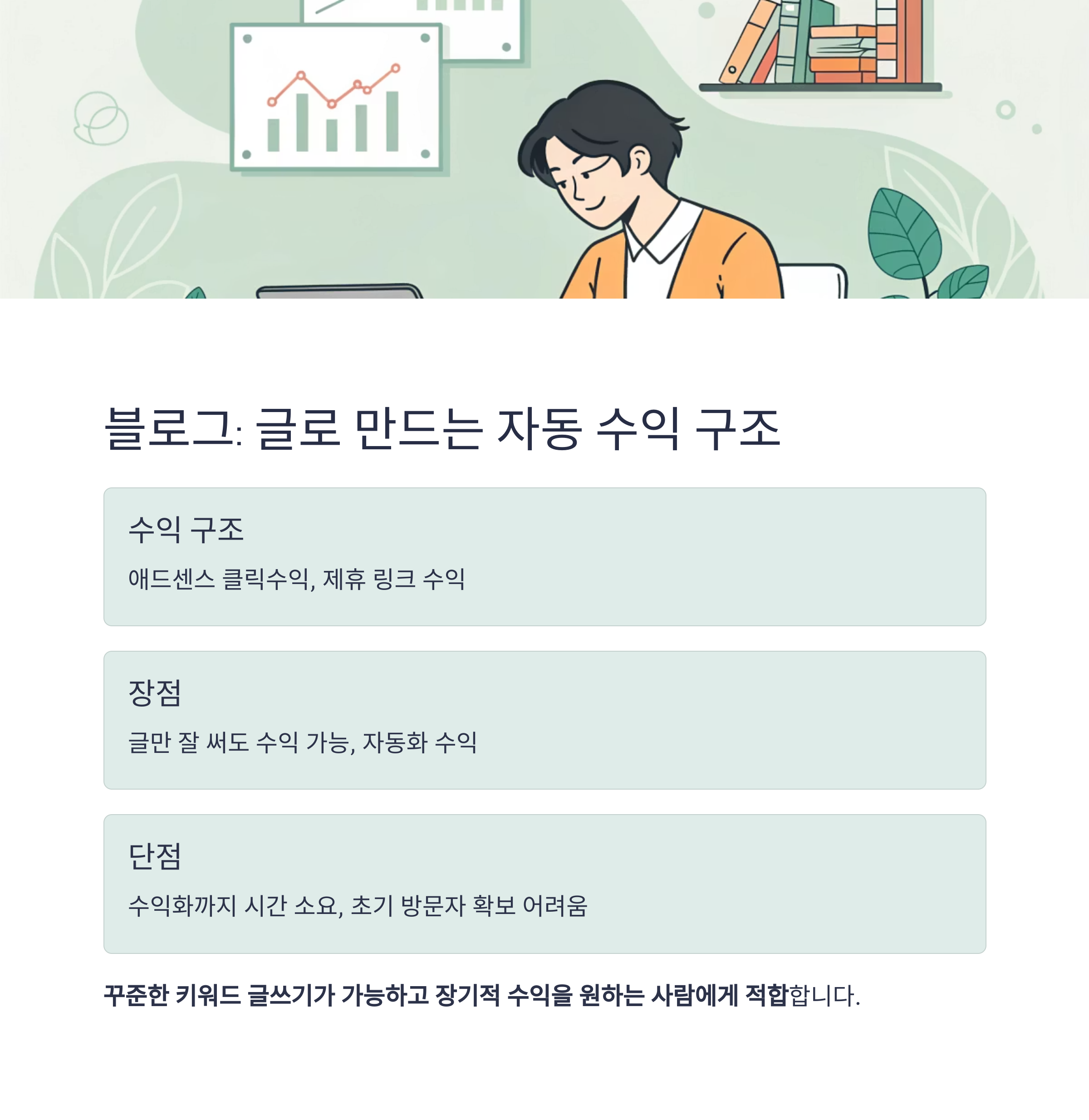 | 장점 | 글만 잘 써도 수익 가능, 자동화 수익 |