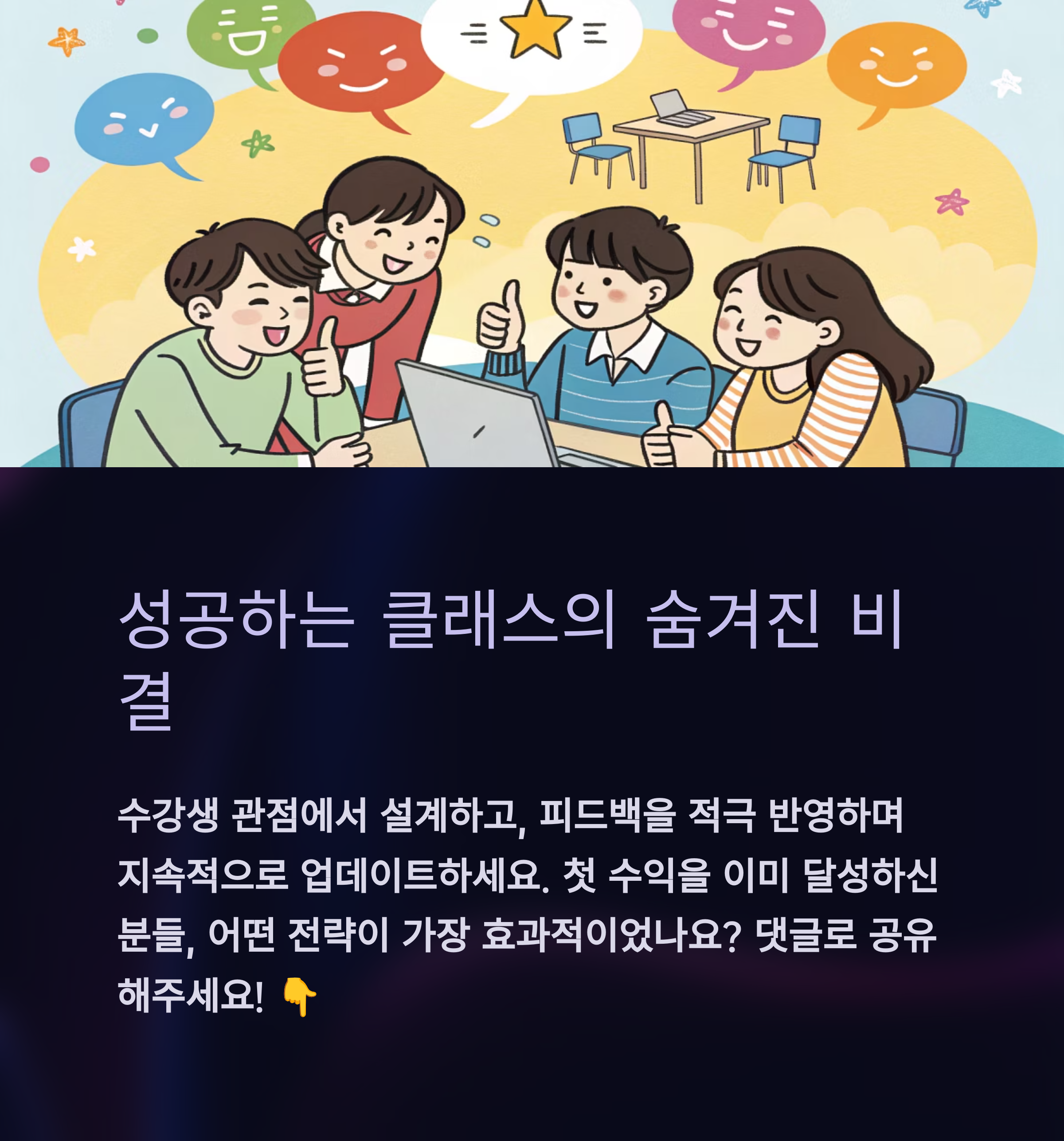 온라인 클래스의 가장 강력한 경쟁력은 고객의 관점입니다. 강의 내용은 전문가 시선이 아니라, 수강생이 무엇을 궁금해하고 해결하고 싶은지를 기준으로 만들어야 합니다. 또한 강의 완료 후 피드백을 받고 개선해 나가는 반복적 운영 전략도 지속 가능한 수익을 만드는 핵심입니다.