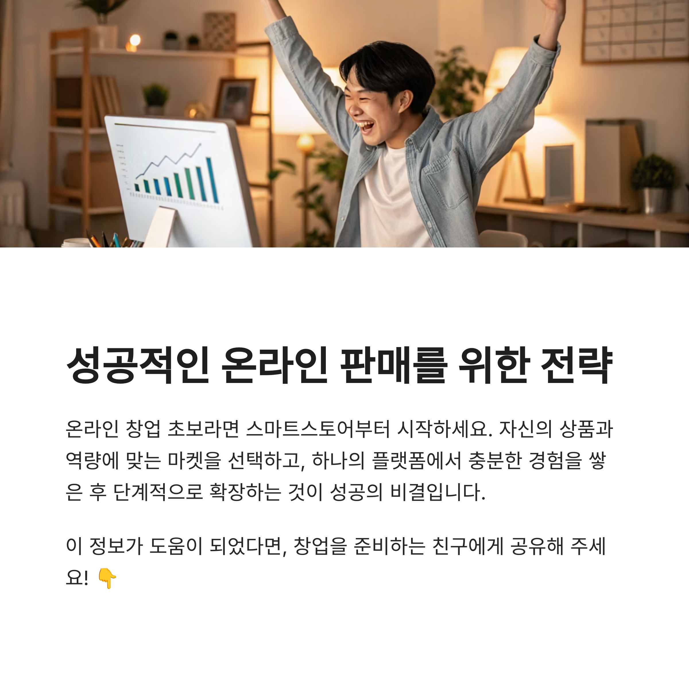온라인 판매는 플랫폼 선택이 수익 구조를 결정합니다. 처음부터 여러 곳에 손대기보다는 하나의 마켓에서 판매, 배송, 고객응대까지의 루틴을 익히는 것이 중요합니다. 이후 내 상품에 맞는 마켓으로 확장하면 운영의 효율성과 수익성을 모두 챙길 수 있습니다. 지금 내게 가장 적합한 마켓은 어디일까요? 오늘부터 한 걸음 시작해보세요.