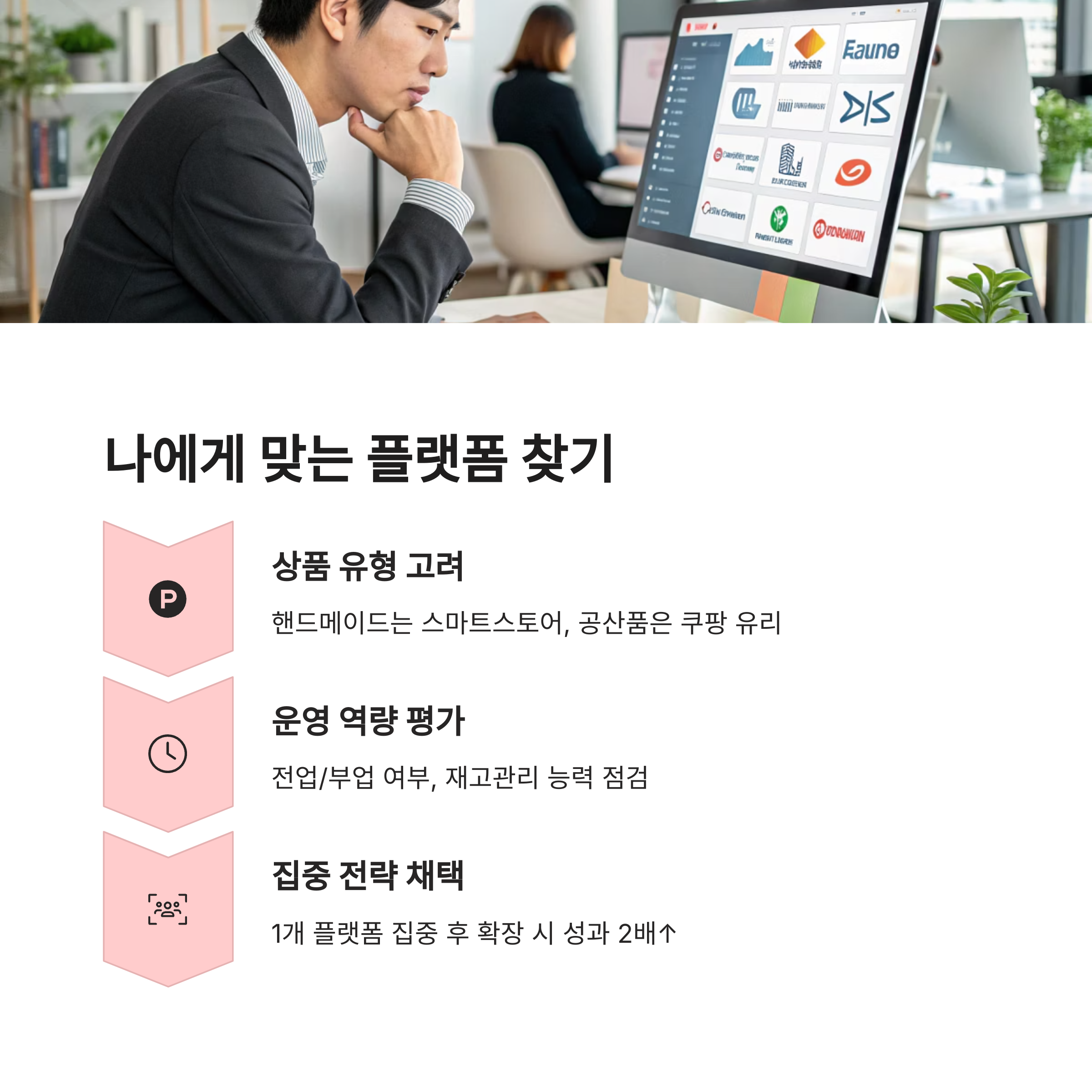 | 선택 기준 | 운영 편의성, 초기 진입 장벽, 수수료 구조, 고객층, 상품 카테고리와의 궁합 |