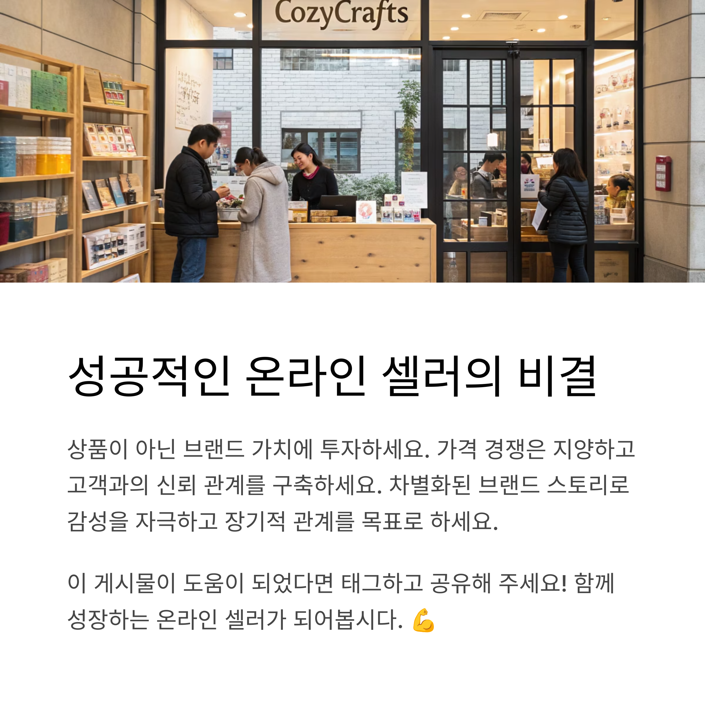 지금까지의 경험을 통해 제가 깨달은 가장 큰 진리는, 온라인 판매는 단순한 제품 유통이 아니라 고객과의 관계를 만들어가는 일이라는 것입니다. 수많은 판매자와 수많은 제품들 사이에서 선택받기 위해선, '왜 이 브랜드를 선택해야 하는가'에 대한 명확한 답이 필요합니다. 브랜딩은 고객의 마음속에 자리잡는 유일한 수단이며, 그 안에서 우리는 진정한 지속가능한 수익 모델을 설계할 수 있습니다. 여러분도 지금 이 순간부터 브랜딩의 중요성을 다시 생각해보시길 바랍니다.