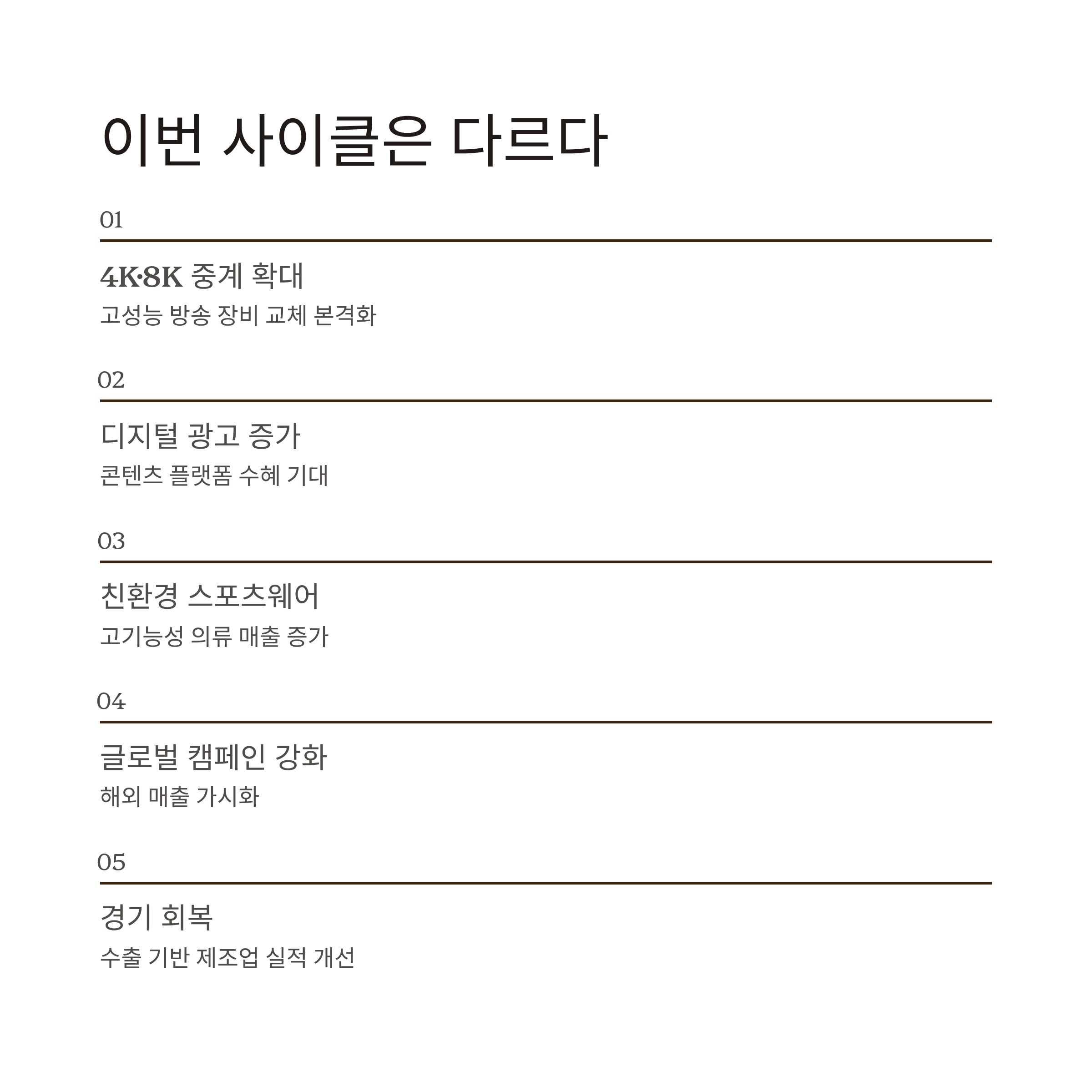 글로벌 경기 회복 기대, 4K/8K 방송 인프라 업그레이드, 친환경·스마트 스포츠웨어 수요 증가라는 구조적 변화가