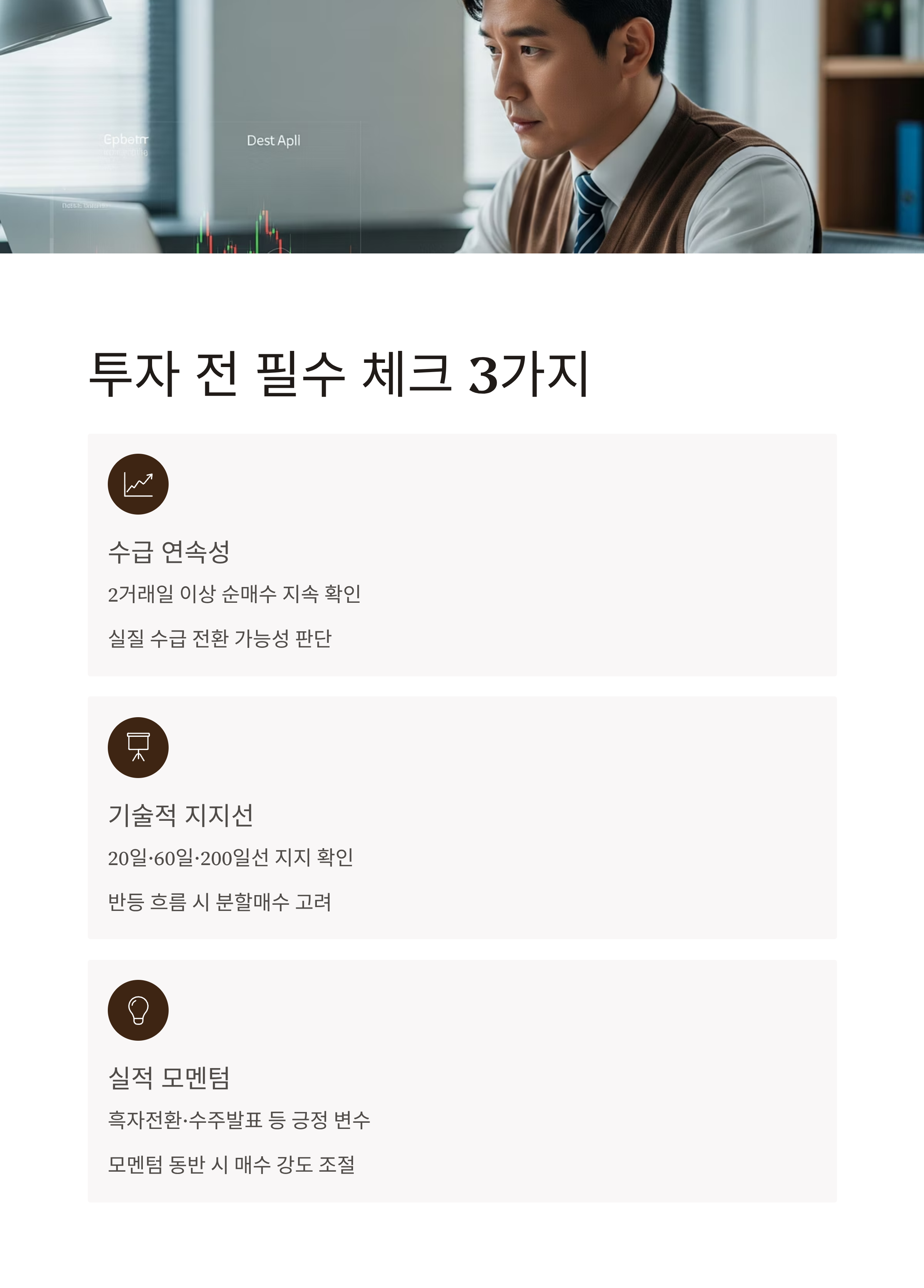 | 수급 연속성 | 외국인 순매수가 1일성인지, 추세적으로 이어지는지 확인 | 2거래일 이상 순매수 지속 시 실질 수급 전환 가능성 ↑ |