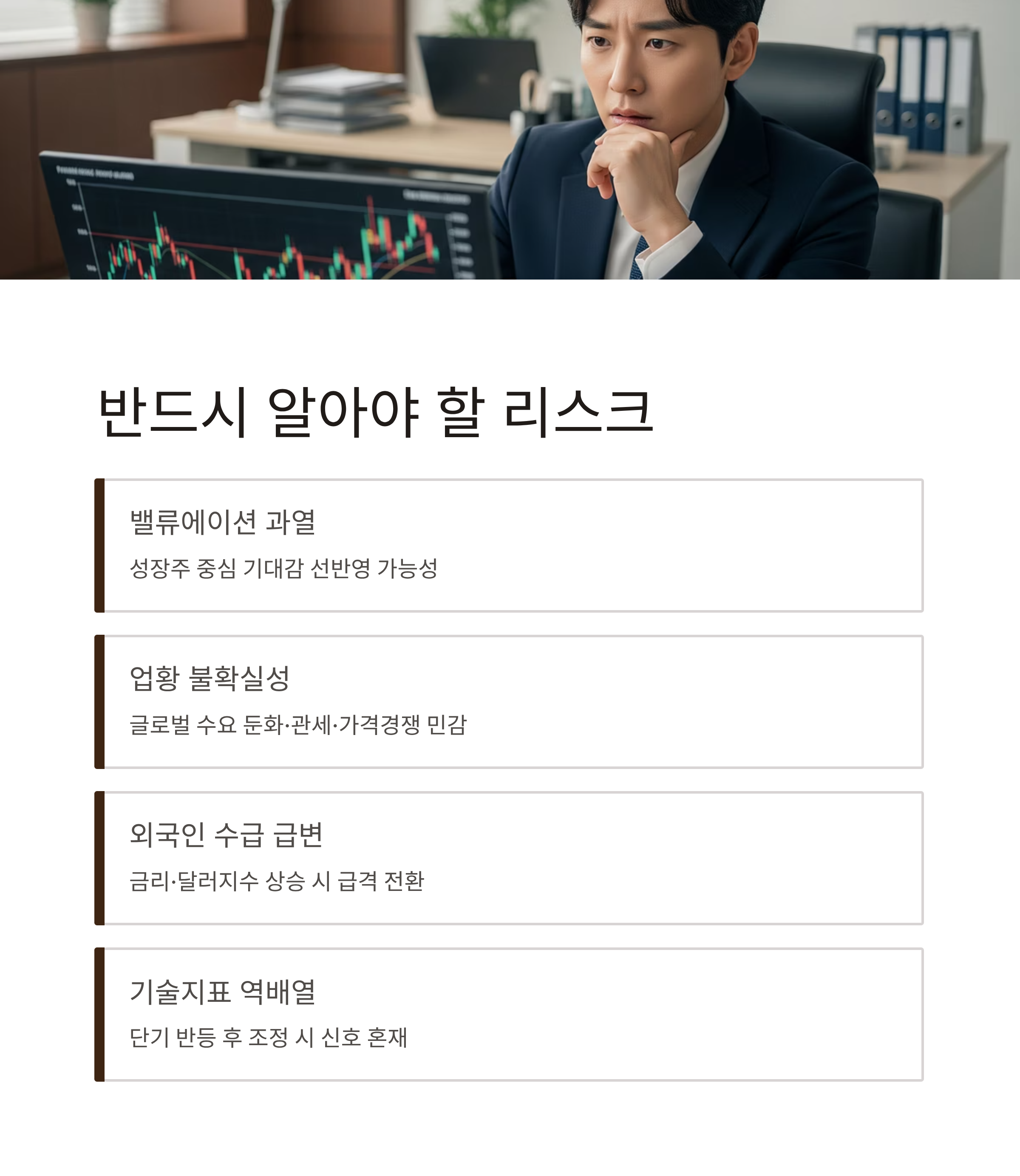| 업황 불확실성 | 반도체, 2차전지 업종은 글로벌 수요 둔화·관세·가격경쟁 등 변수에 민감 |