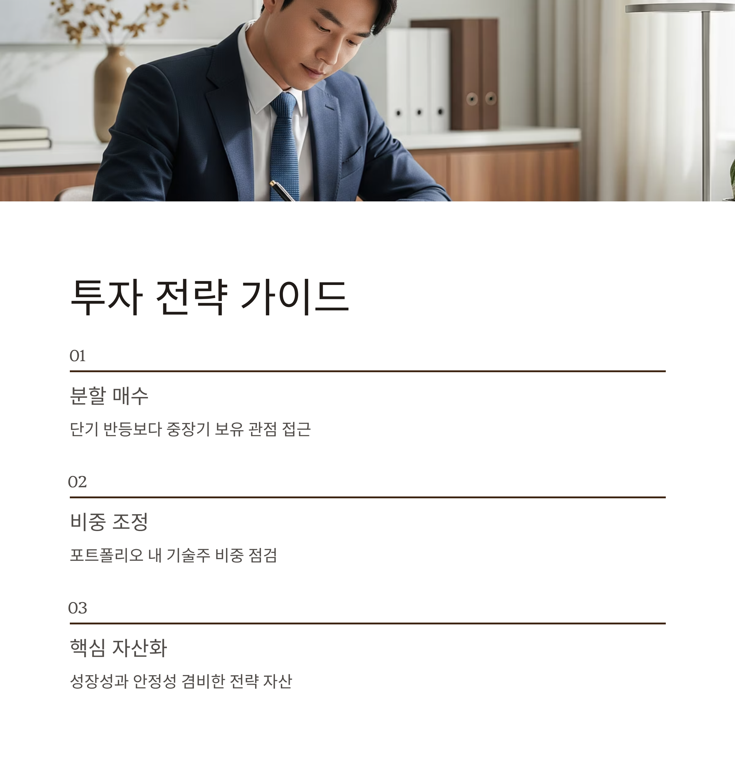 다만, 진입 시에는 분할매수 전략이 좋습니다. 단기 반등보다는 중장기 보유 관점에서 기술섹터 대표주로서 편입해보는 것이 현실적인 접근입니다.