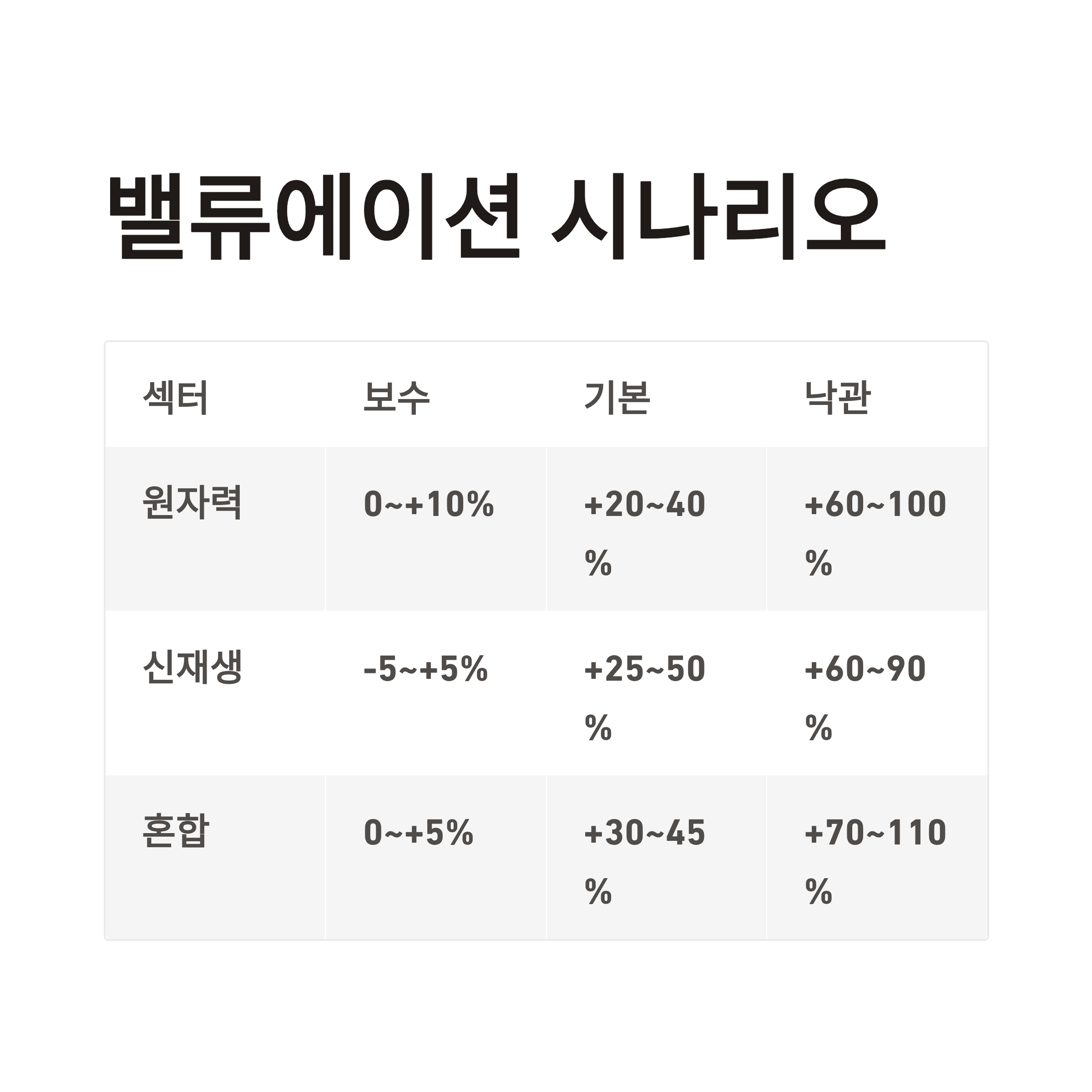 | 원자력 관련주 | ± 0~+10% | +20~40% | +60~100% |
