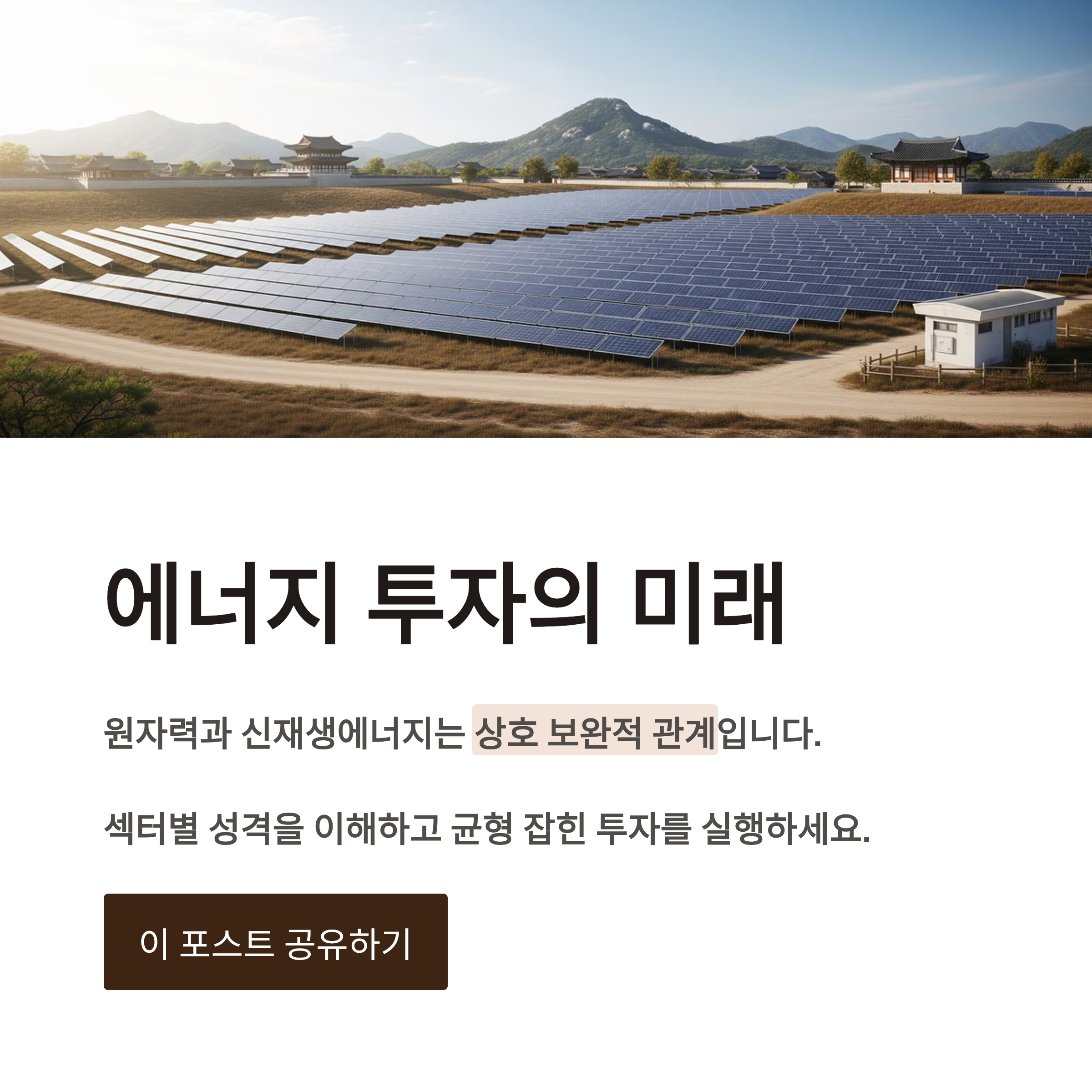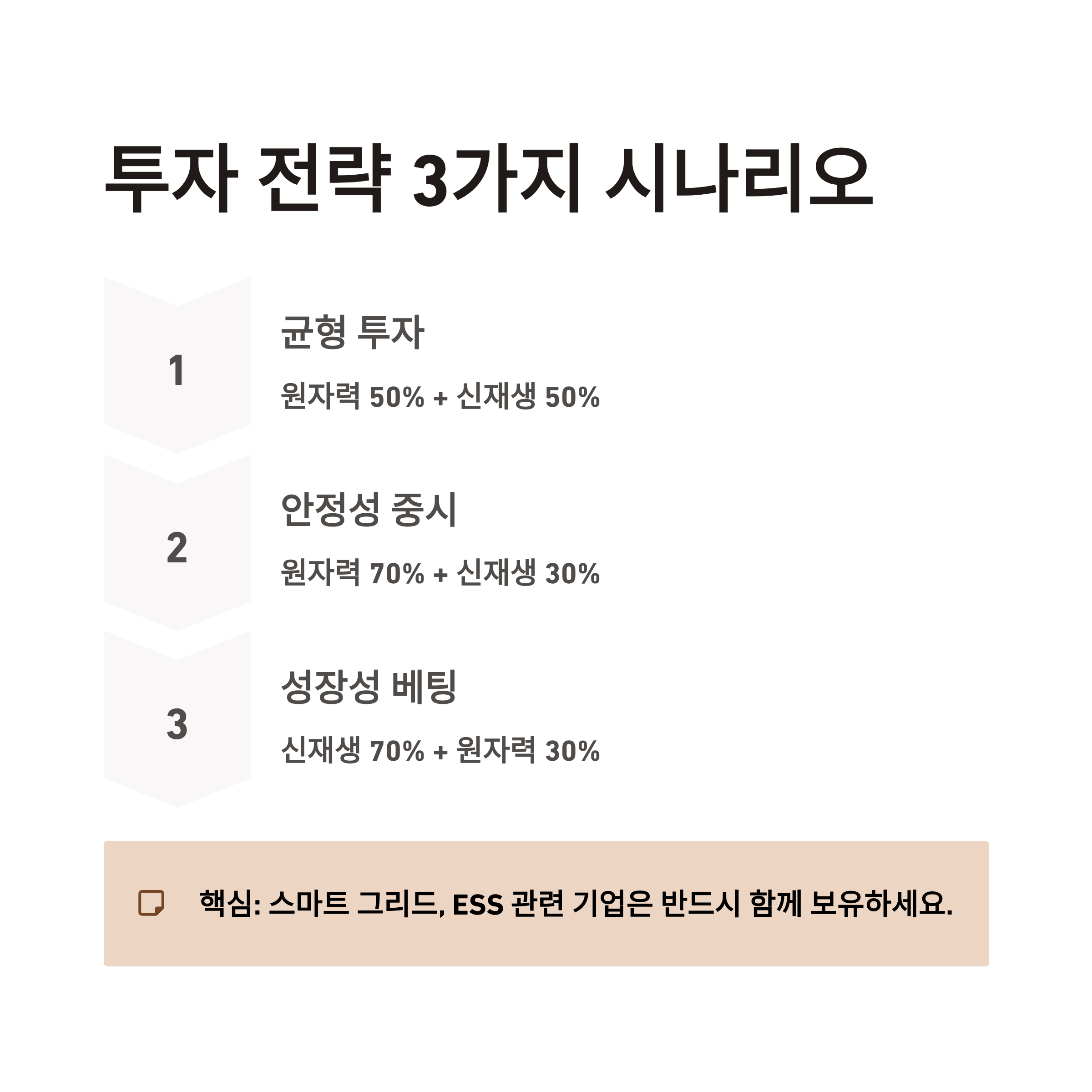 | 균형 투자 전략 | 원자력과 신재생 모두를 적절히 보유하여 리스크 분산 | 원자력 50% + 신재생 50% |