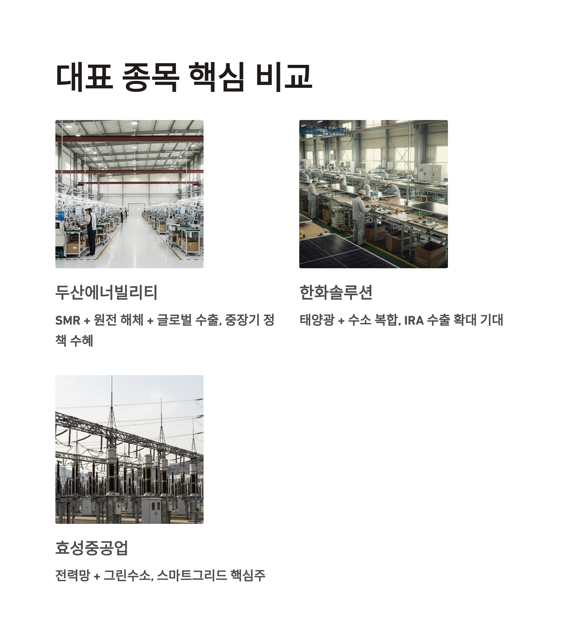 | 효성중공업 | 전력망 + 그린수소 + 인프라 구축 | 스마트그리드 & 재생 인프라 핵심주 |