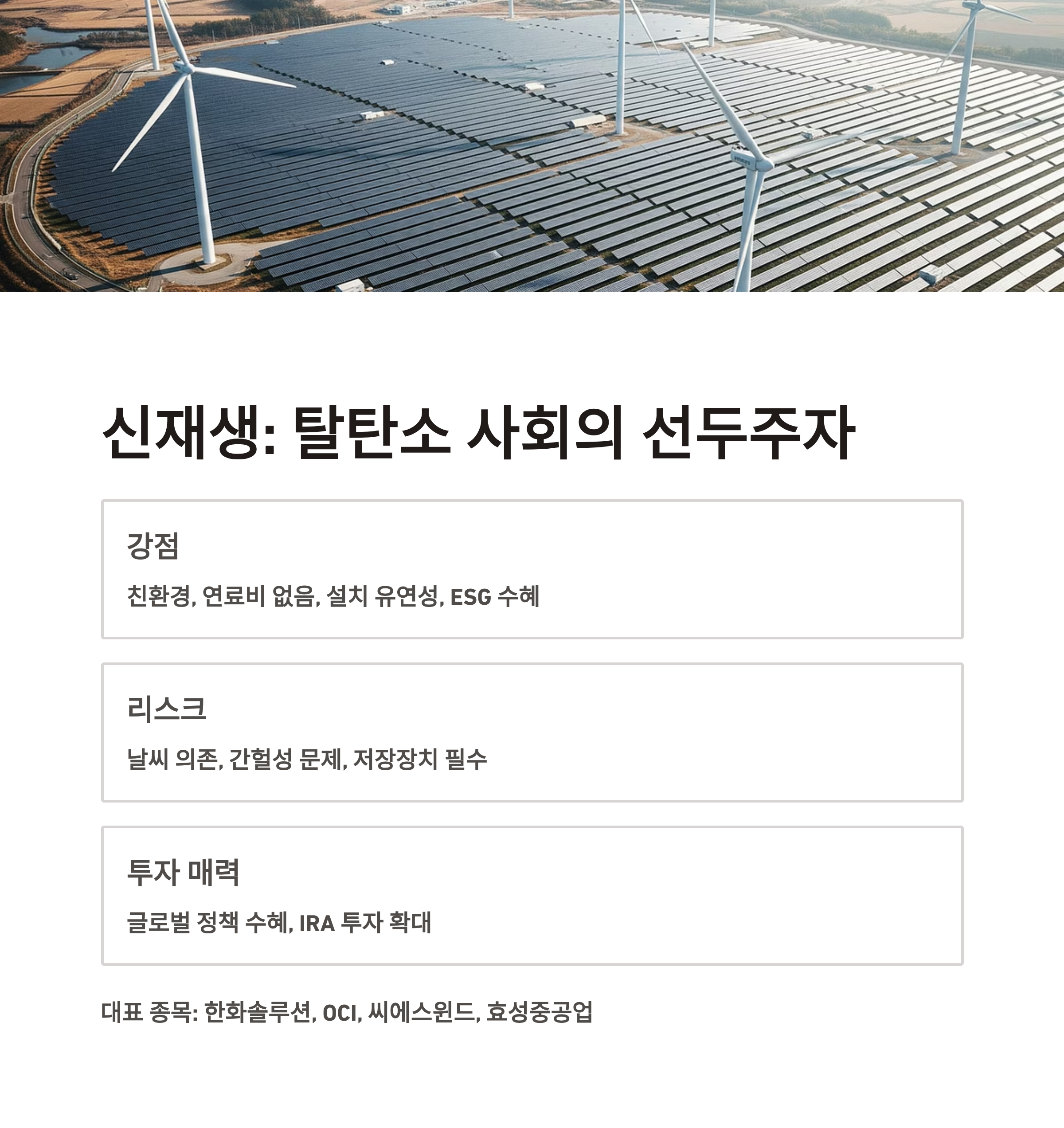 | 리스크 | 날씨 의존도, 간헐성 문제, 저장장치 필수, 원자재 가격 변수 |