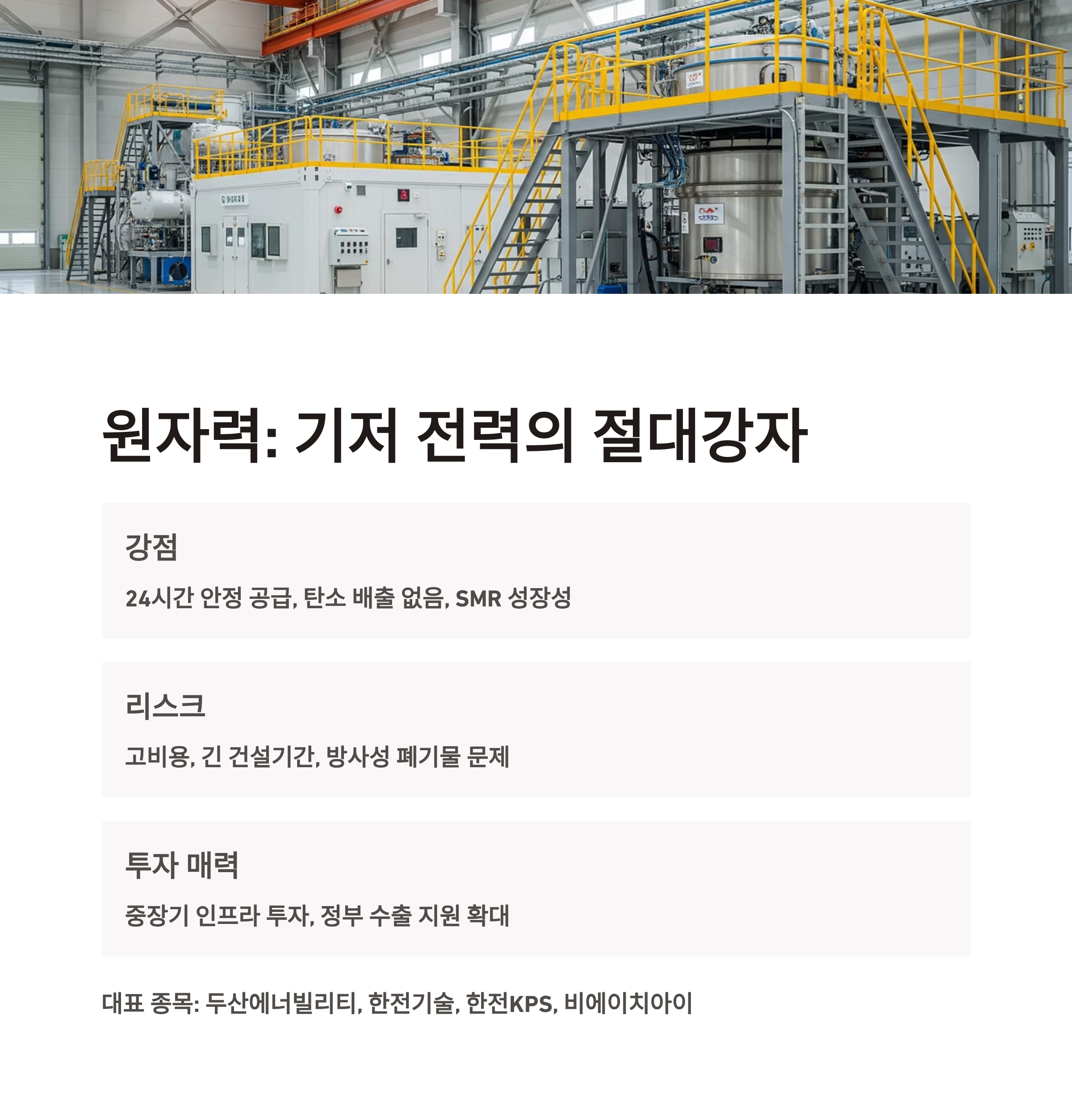 | 강점 | 24시간 안정적 공급, 탄소 배출 없음, SMR 기술 성장성 |