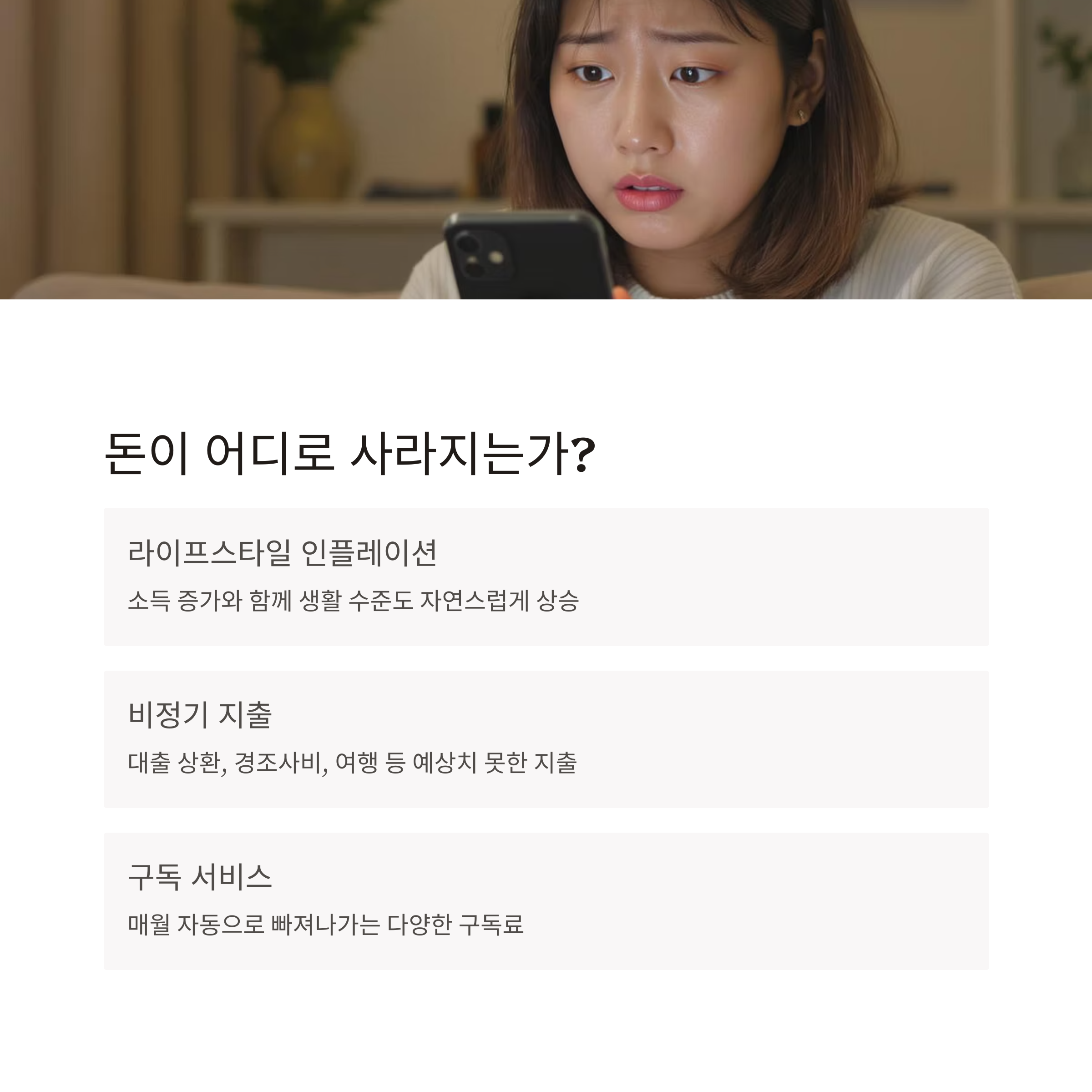 또한 대출 상환, 경조사비, 여행, 구독료, 비정기 지출이 습관처럼 소비되면서 자산 증식이 더뎌집니다.