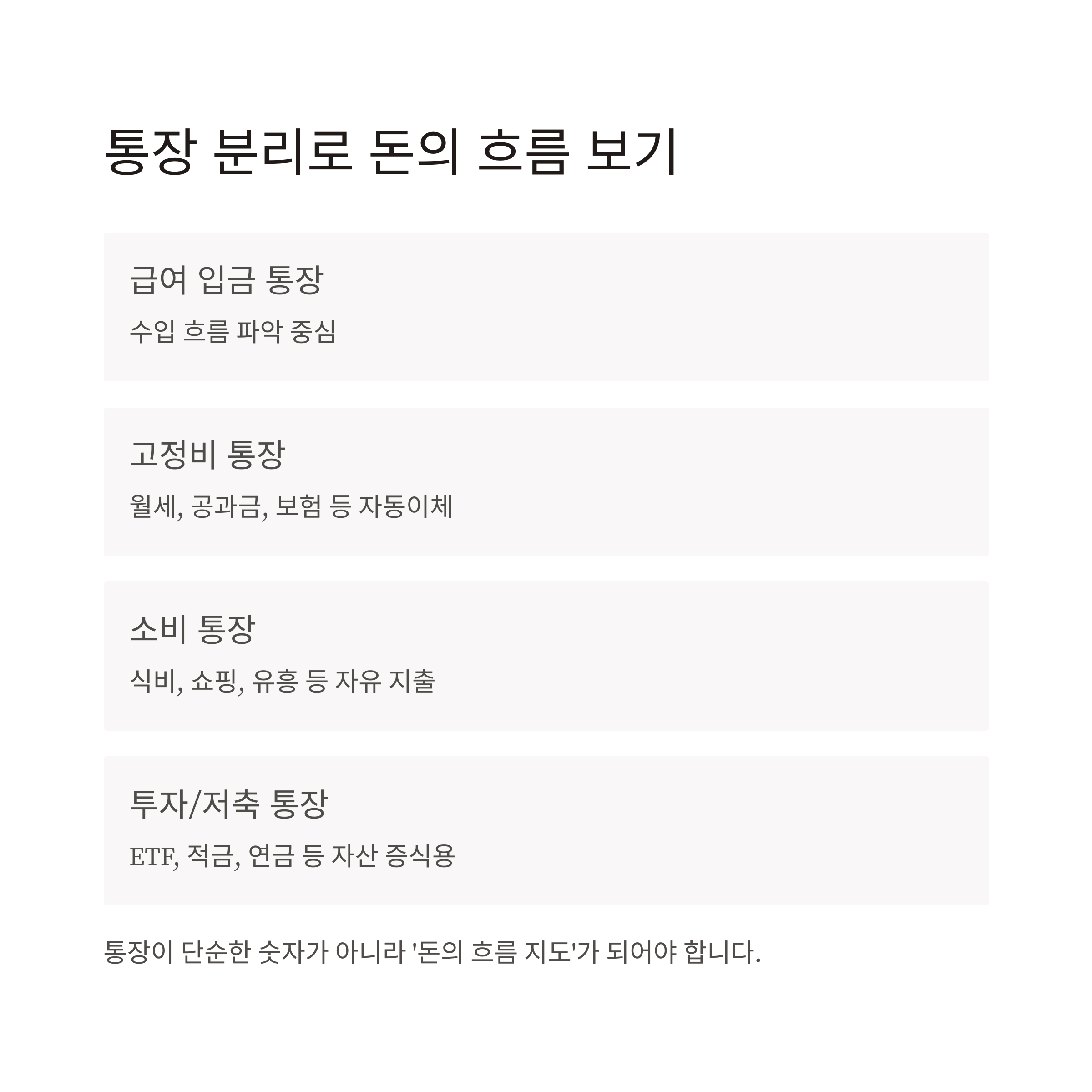 3~4개의 통장으로 역할을 분리하면, 소비와 저축의 경계가 명확해져 행동도 달라집니다.
