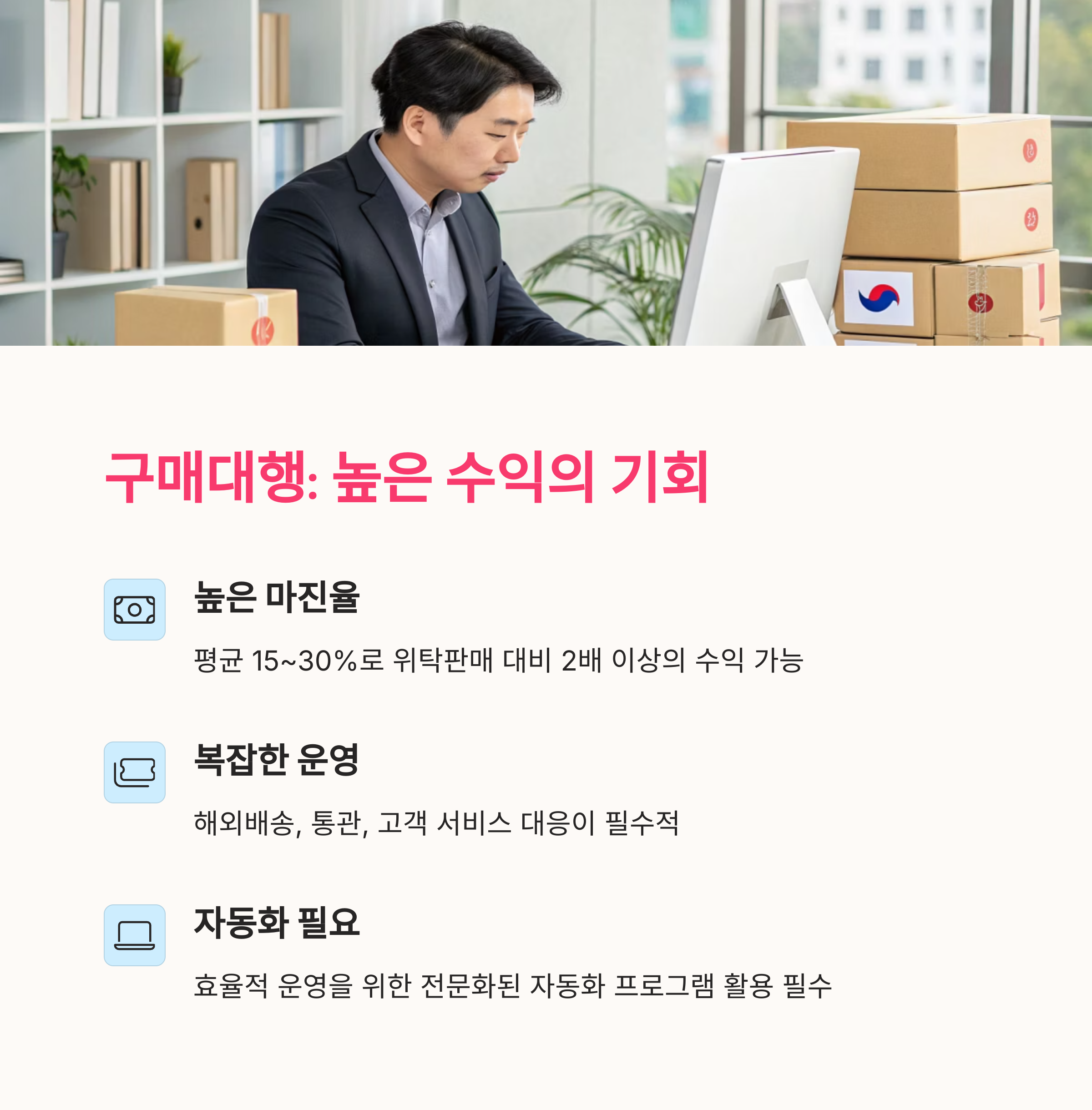 해외구매대행은 일정 수준의 시스템 이해도와 해외 플랫폼 활용 능력이 필요합니다. 고객이 주문하면 판매자가 해외 사이트(아마존, 타오바오 등)에서 상품을 구매해 대신 보내주는 구조이기 때문에, 언어, 환율, 배송지연, 관세 등 다양한 변수에 대한 대응력이 요구됩니다. 수익률은 높은 편이나, CS 응대 난이도가 올라가므로 초보자에게는 다소 복잡할 수 있습니다. 경험자나 자동화 프로그램을 활용할 수 있는 중급자 이상에게 적합합니다.