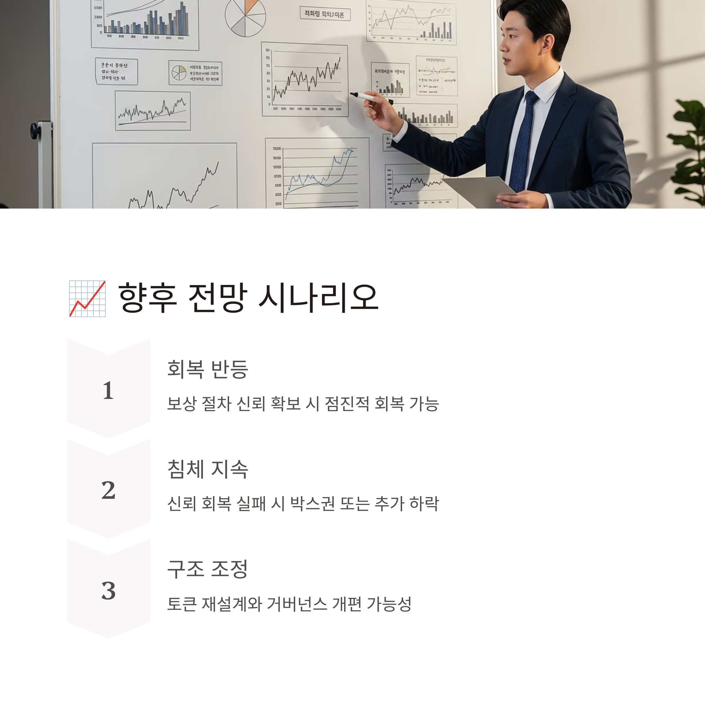 | 회복 반등 | 보상 절차 신뢰 확보, 자산 회수, 사용자 유입 지속 | 중간 | 가격 안정 후 점진적 회복 |