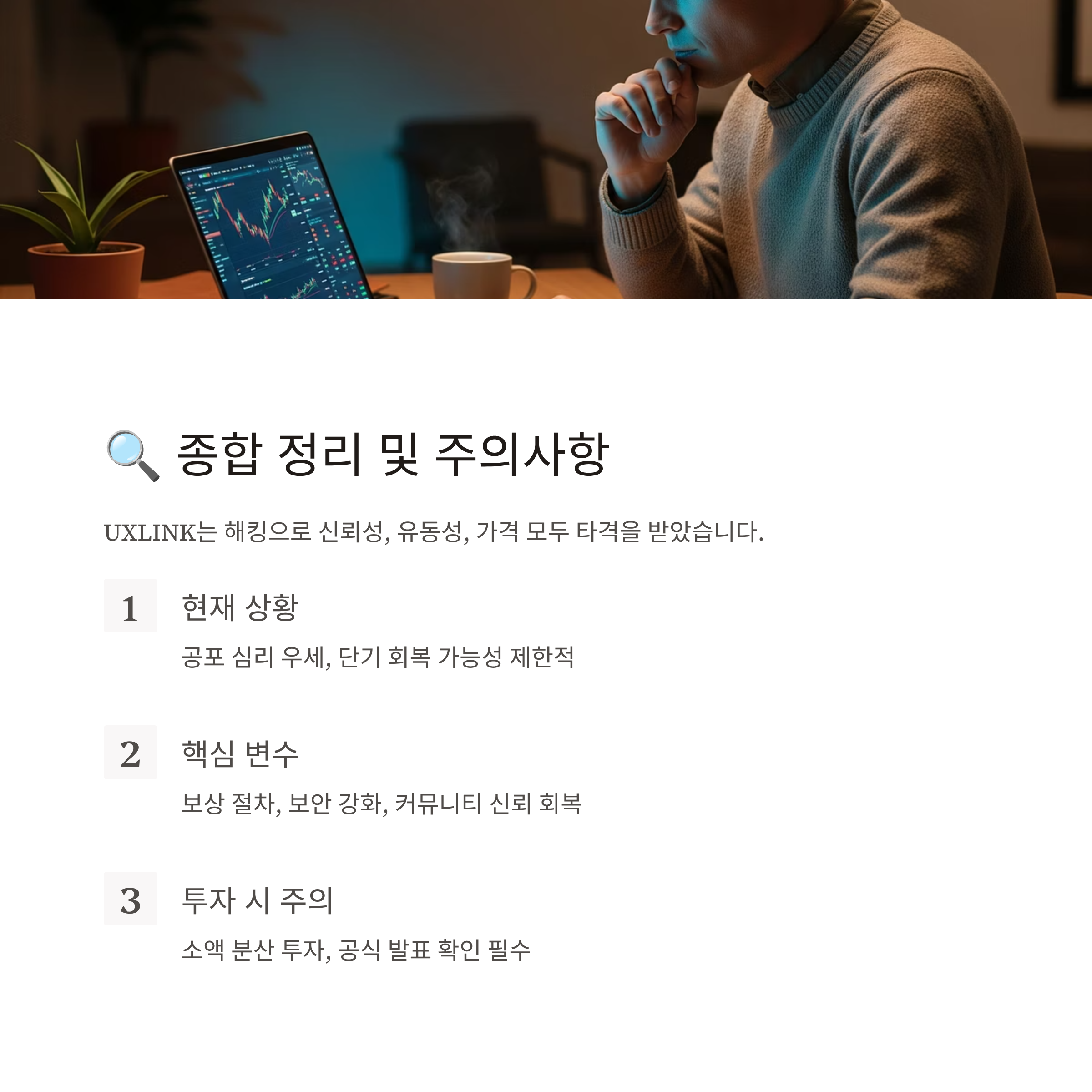 - 유엑스링크는 멀티시그 해킹 사건으로 신뢰성·유동성·가격 모두 타격을 입음.