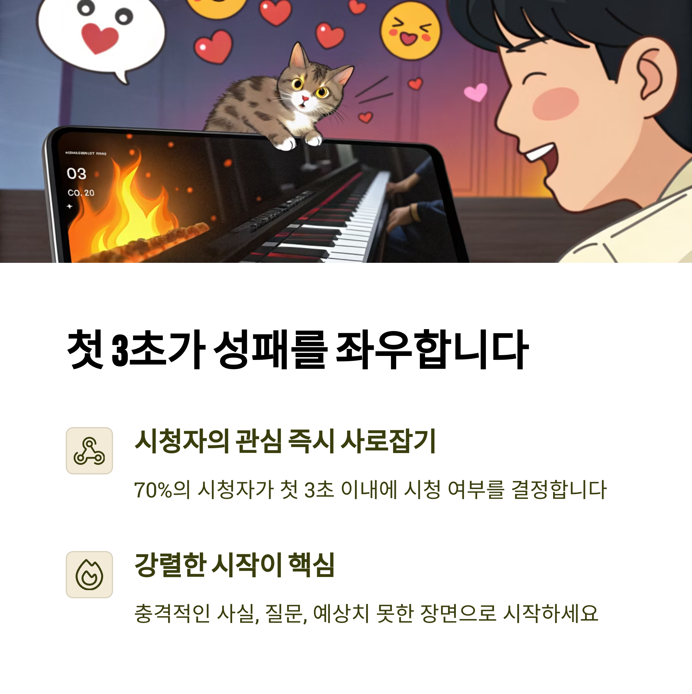 | 영상 + 자막 + 음악 조합으로 완성도 상승 | 반복 시청, 좋아요, 댓글 반응이 확산 요인 | 구독 유도 → 커뮤니티 상품 연결 |