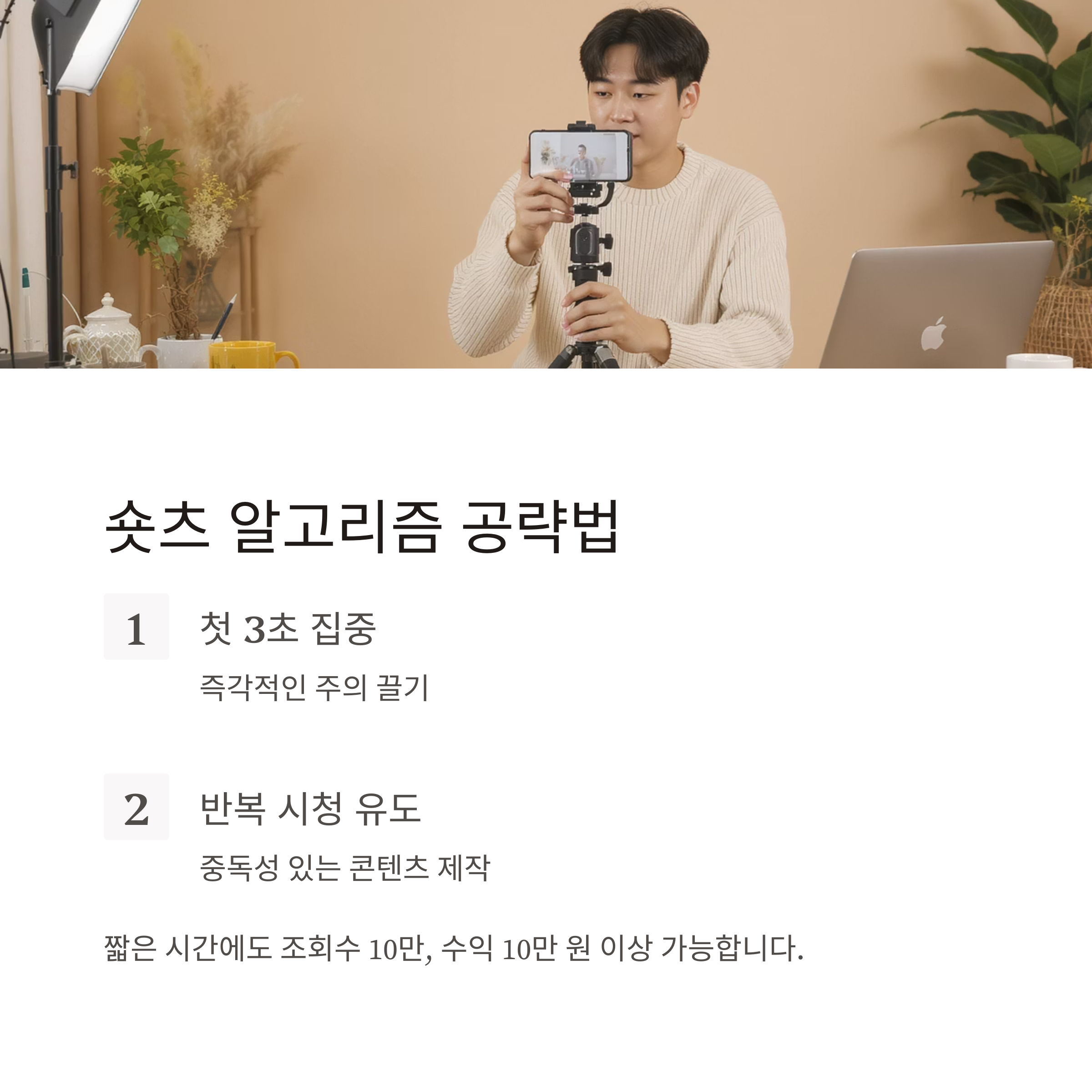 짧은 시간에도 조회수 10만, 수익 10만 원 이상 가능한 구조가 됩니다.