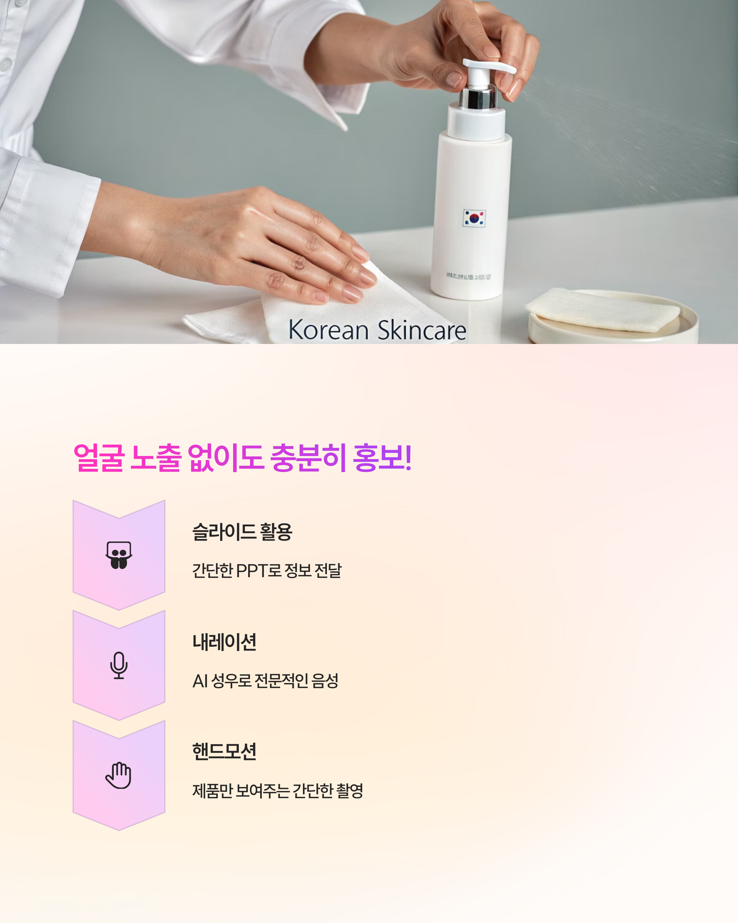 | 추천 대상 | 스토어, 자사몰, SNS 기반 판매자 모두 / 얼굴 노출 없이도 제작 가능 |