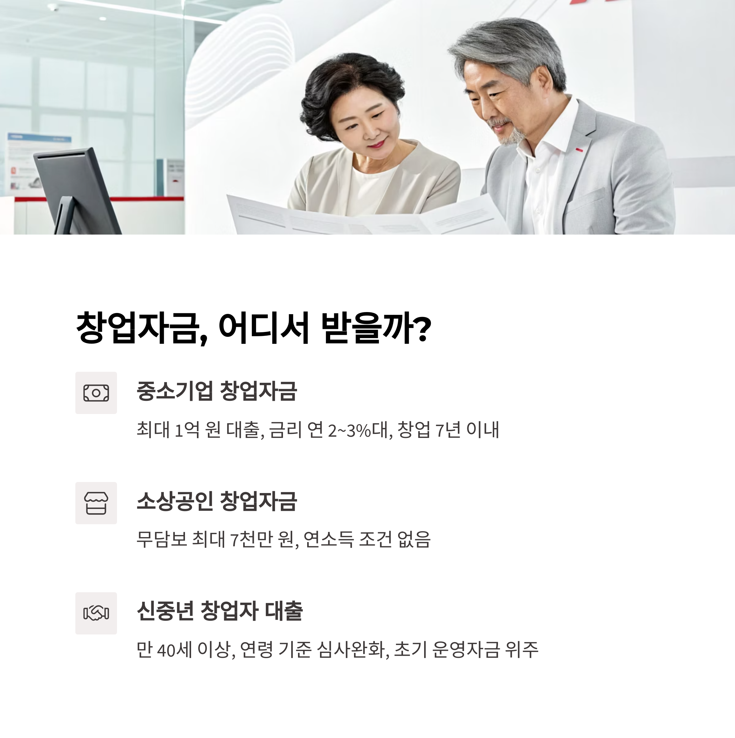 | 신중년 창업자 대출 | 연령 기준 심사완화, 초기 운영자금 위주 | 만 40세 이상 |
