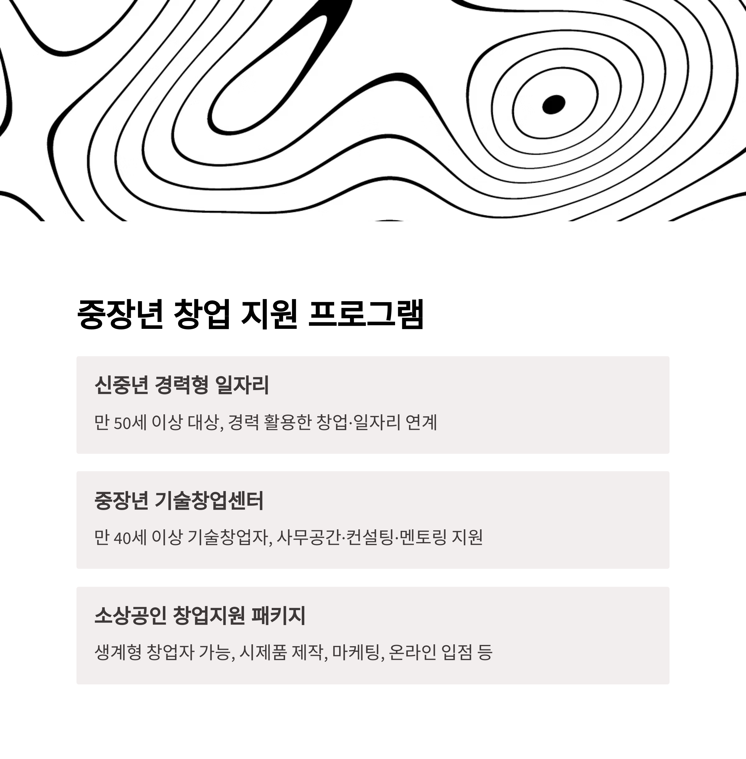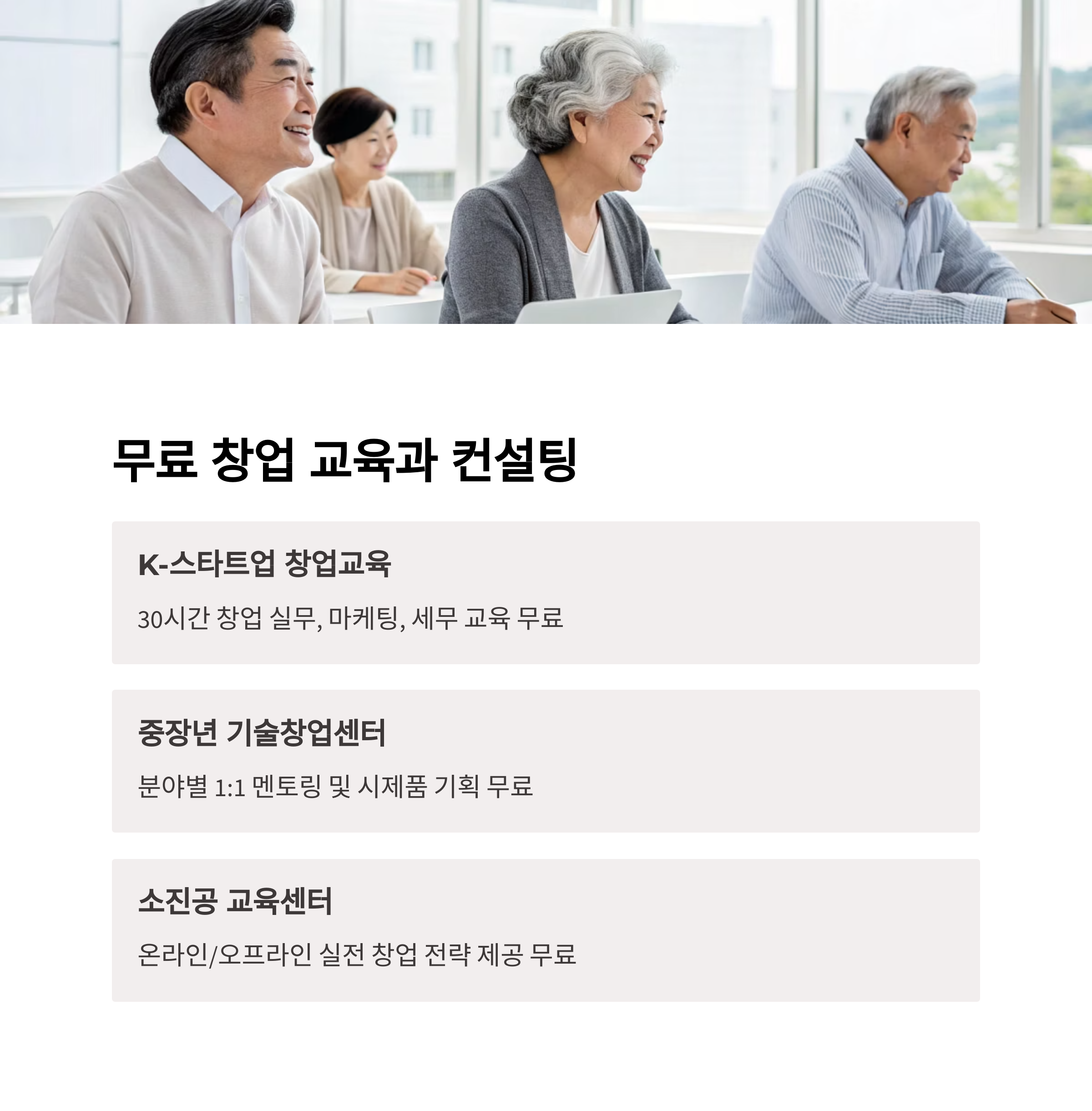 | 중장년 기술창업센터 | 창업 사무공간·컨설팅·멘토링 지원 | 만 40세 이상 기술창업자 |