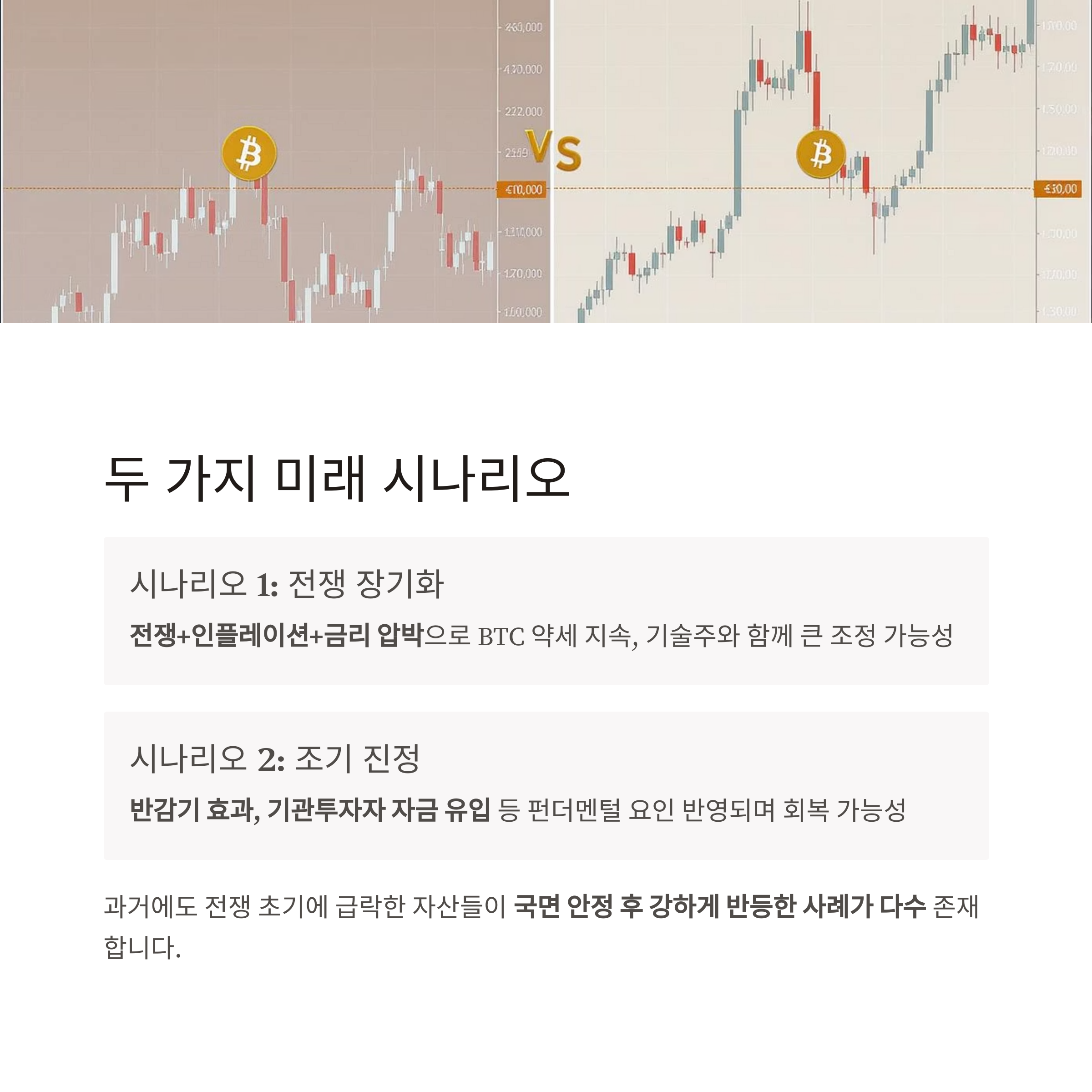 시나리오 2: 조기 진정 또는 휴전 글로벌 위험 회피 심리 완화 BTC 반등 및 펀더멘털 회복