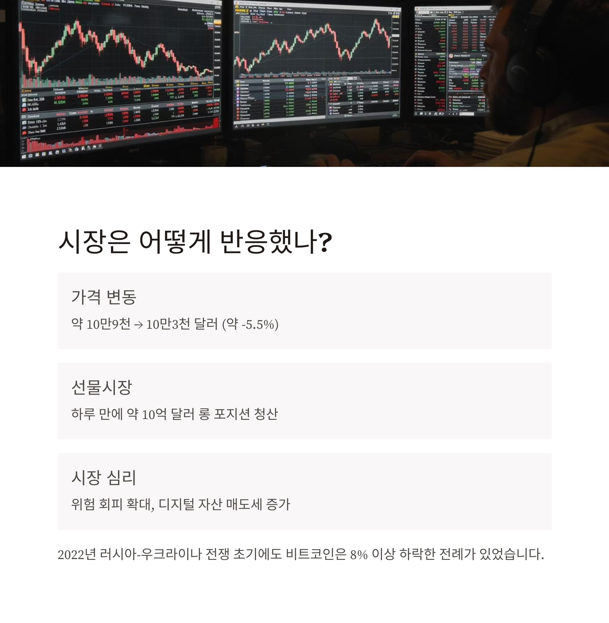 | 전쟁 직후 BTC 가격 | 약 10만9천 → 10만3천 달러 (약 -5.5%) |