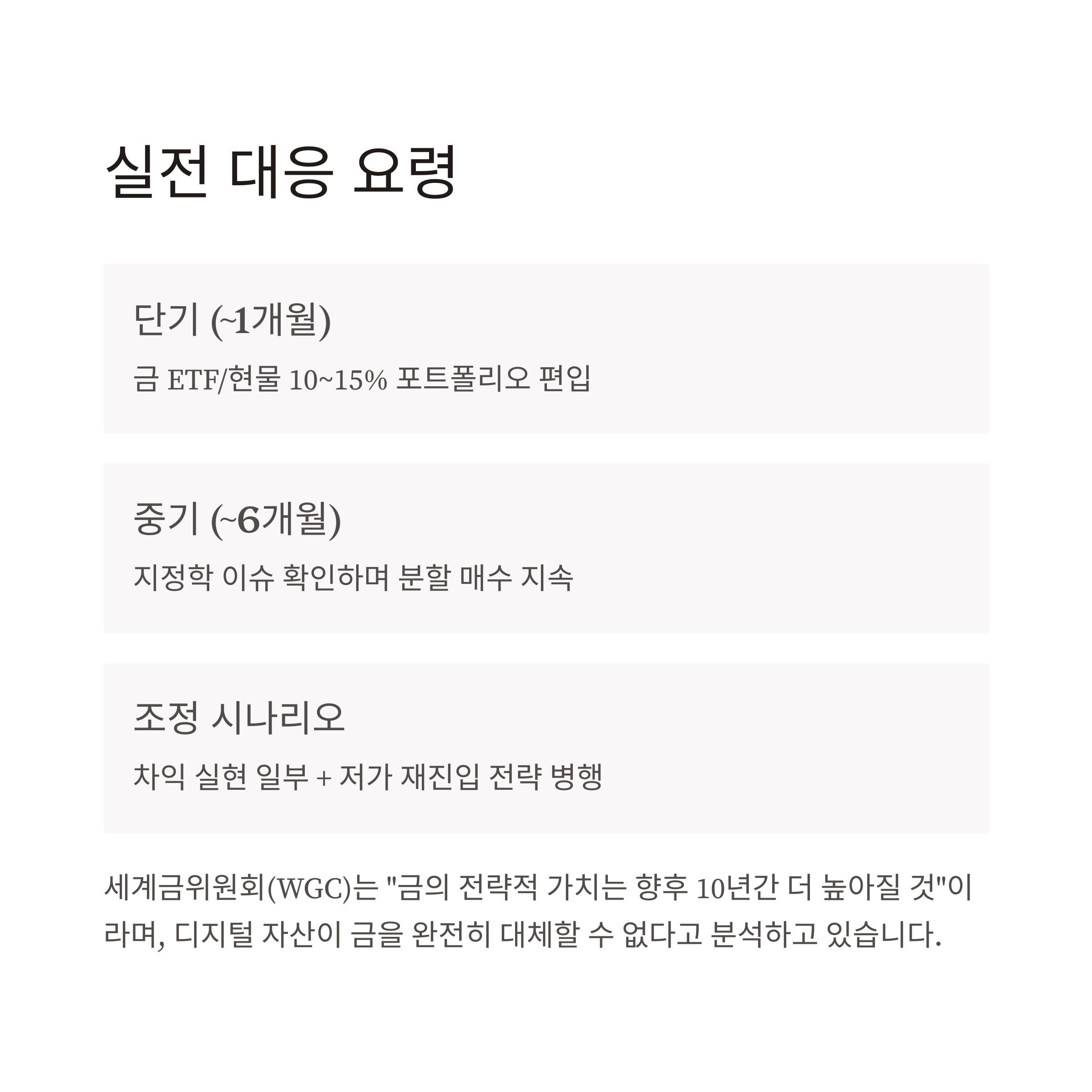 | 단기 (~1개월) | 금 ETF/현물 10~15% 포트폴리오 편입 |