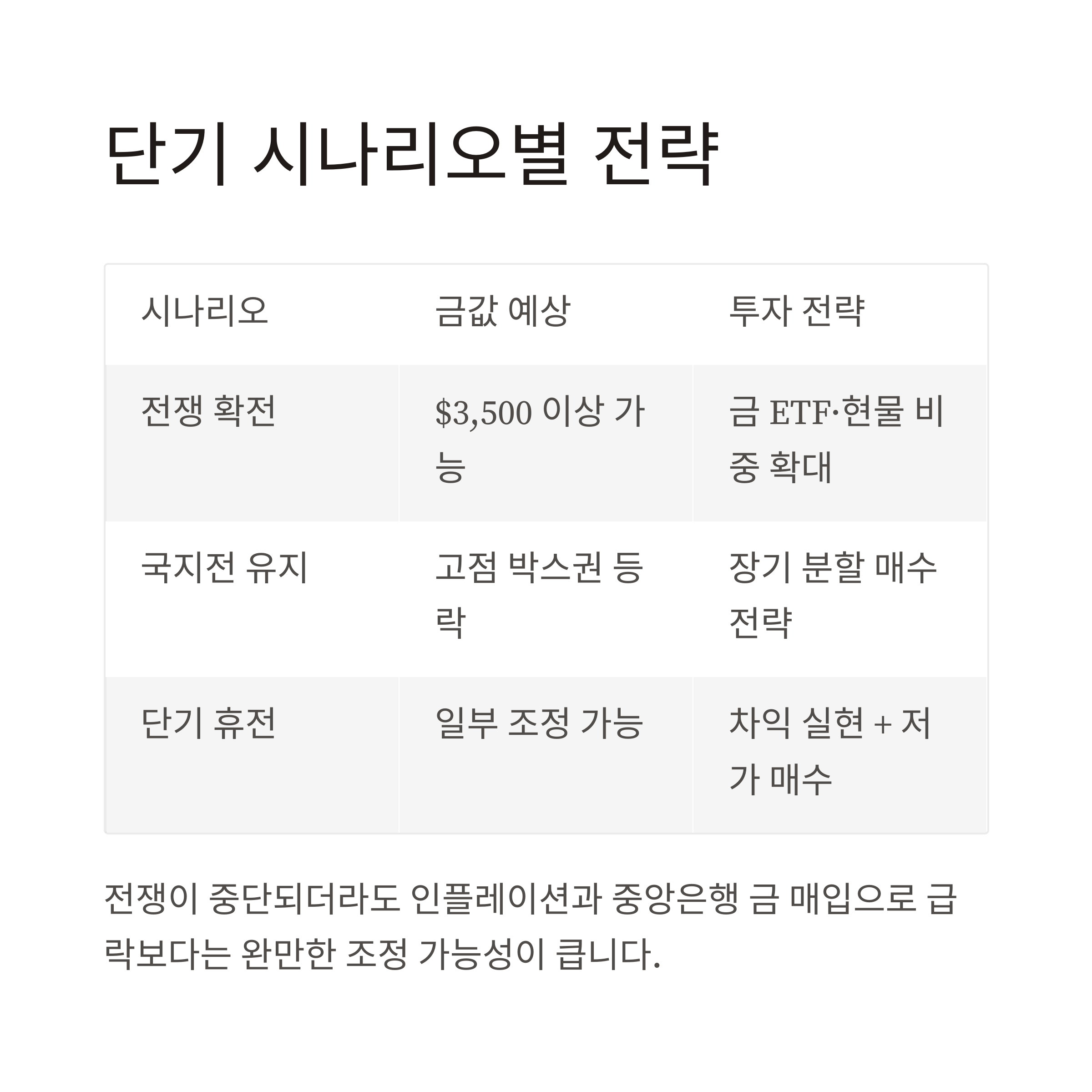 | 전쟁 확전 (예: 호르무즈 봉쇄 등) | 추가 급등, $3,500 이상도 가능 | 금 ETF·현물 비중 확대 |