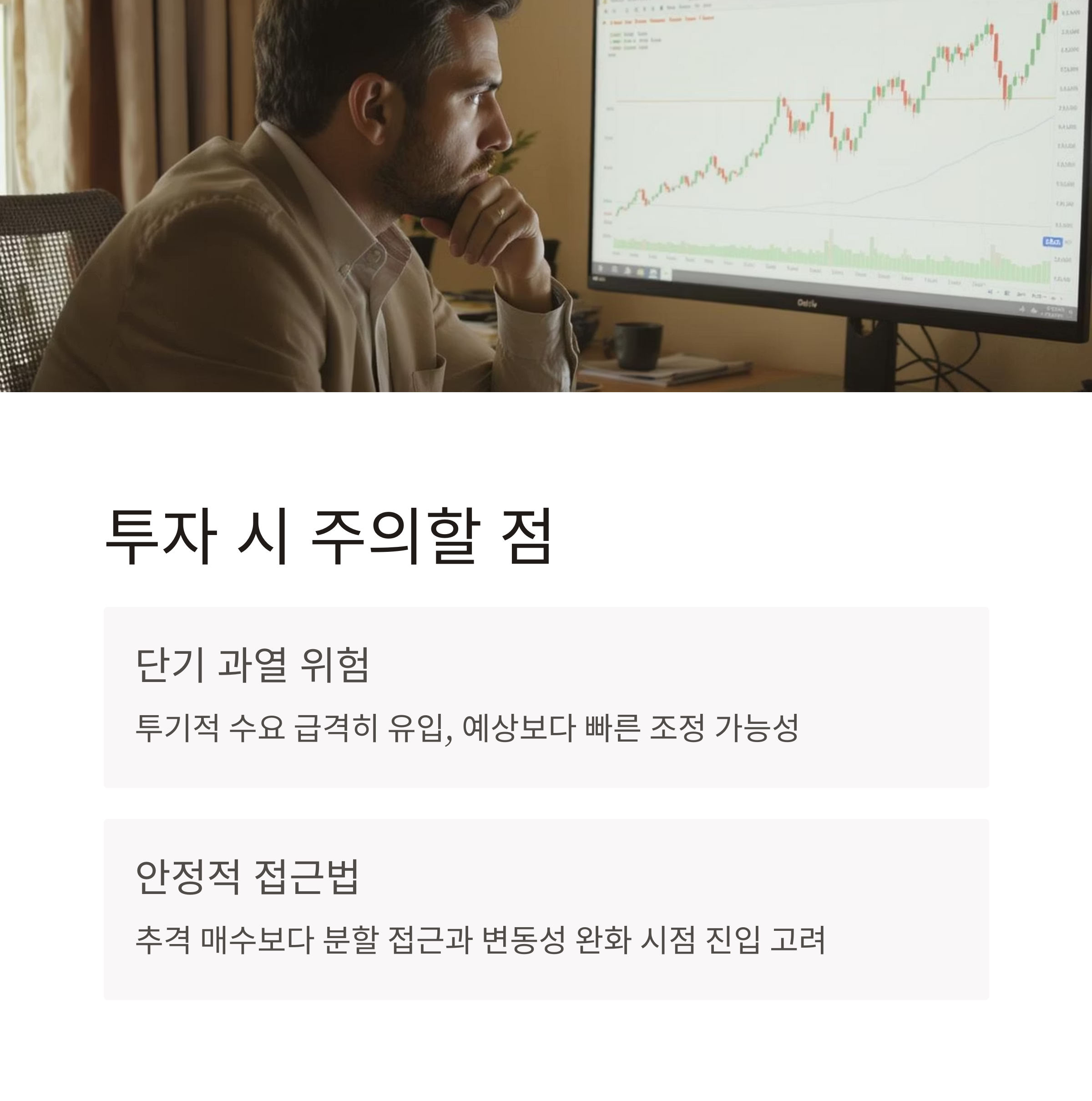 예상보다 빠른 조정이 나올 수 있습니다. - 안정적 수익 추구자는 추격 매수보다 분할 접근과 변동성 완화 시점 진입을 고려해야 합니다.