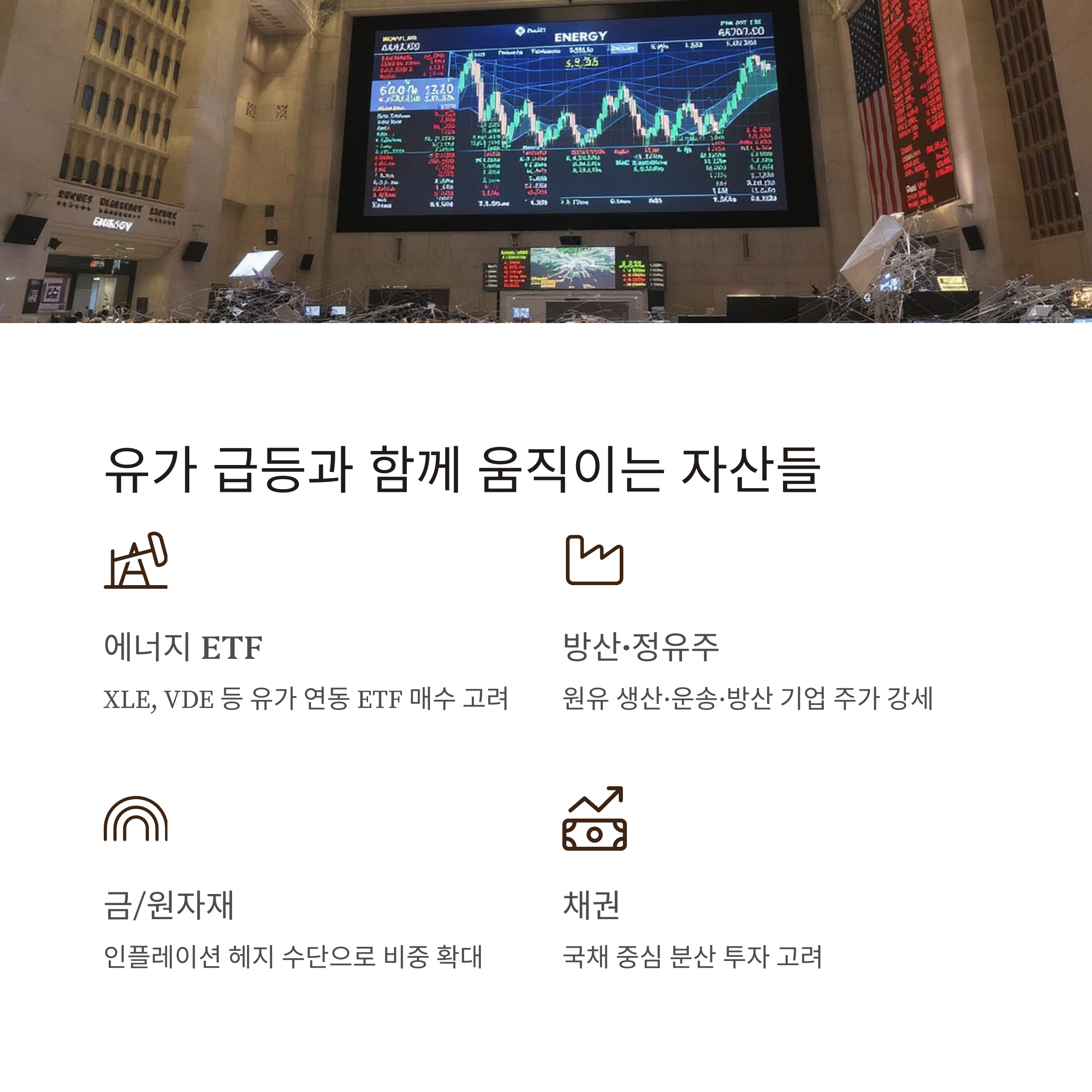 | 에너지 ETF | XLE, VDE 등 유가 연동 ETF 매수 고려 |