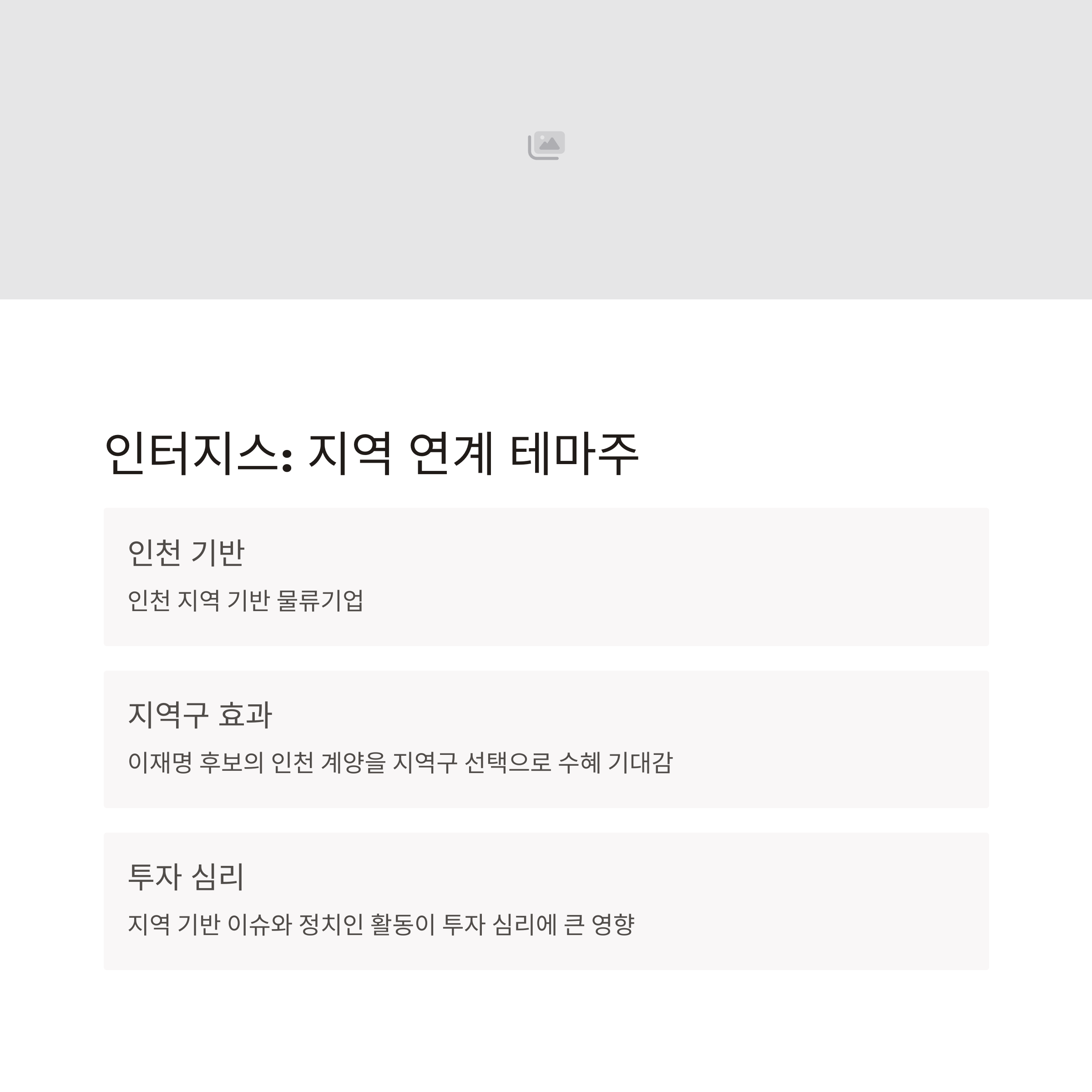 인천 지역 기반 물류기업으로, 이 후보가 인천 계양을 지역구로 삼으면서 수혜 기대감이 반영됐습니다.