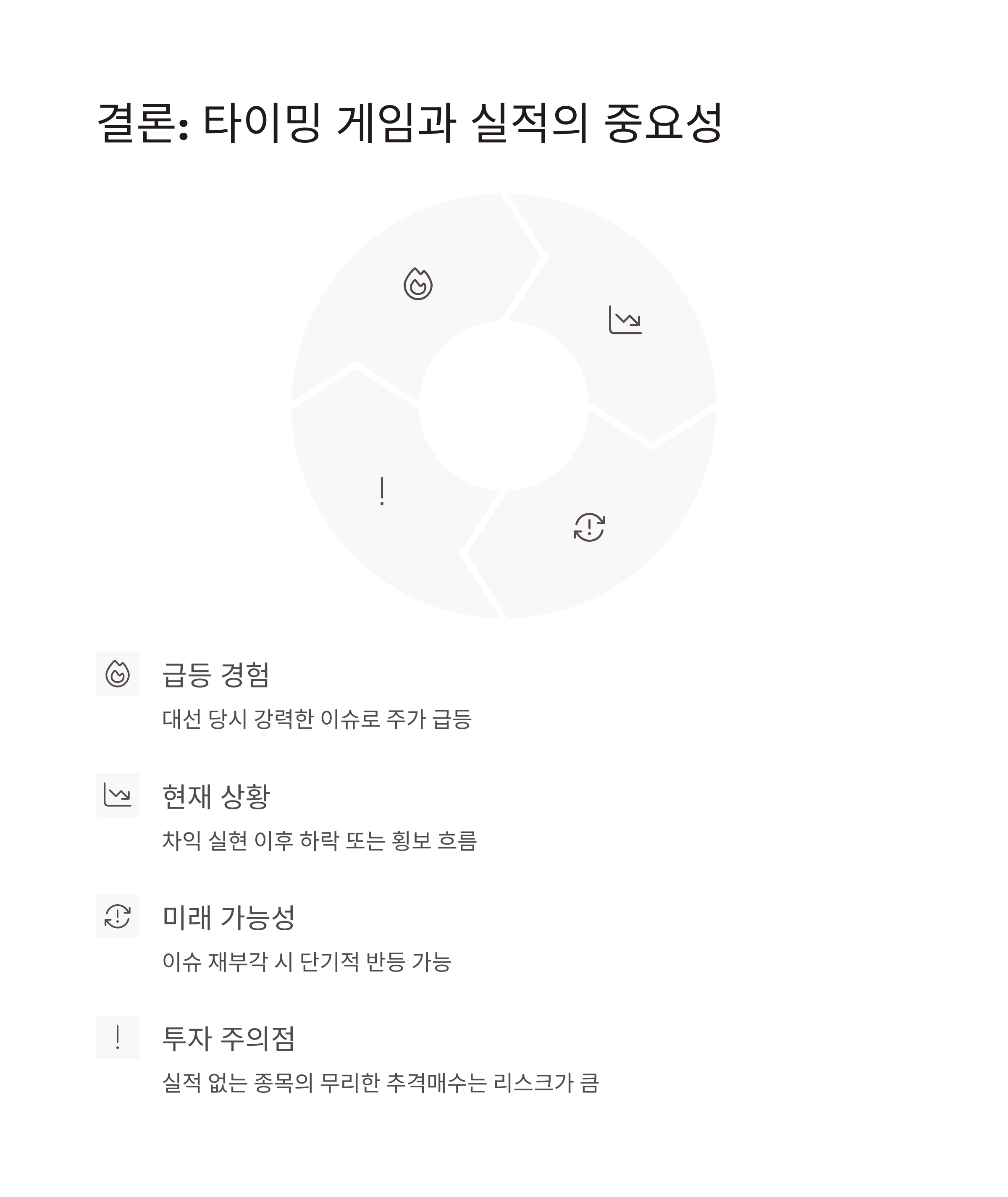 결론: 정치 테마주는 타이밍 게임, 실적은 결국 실체