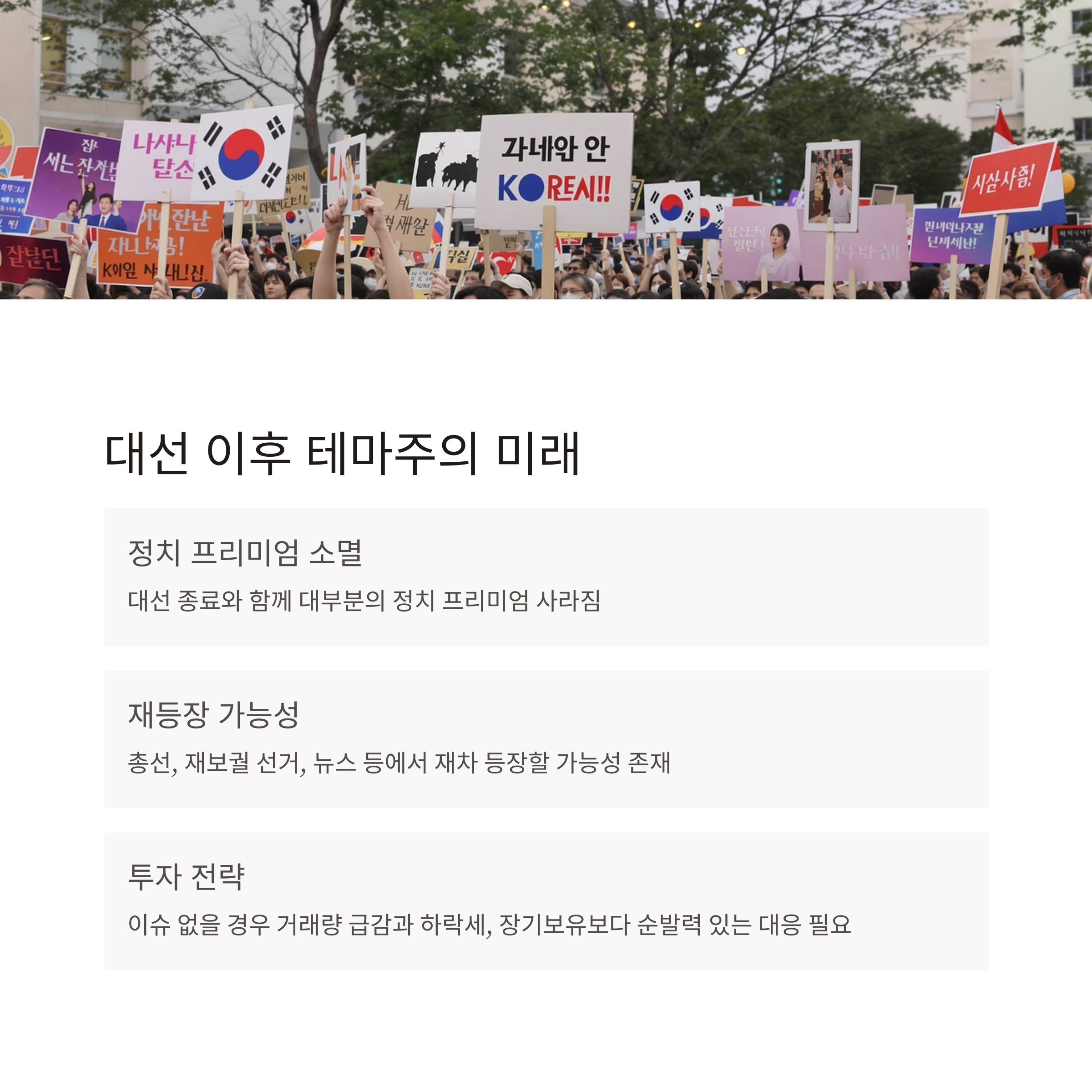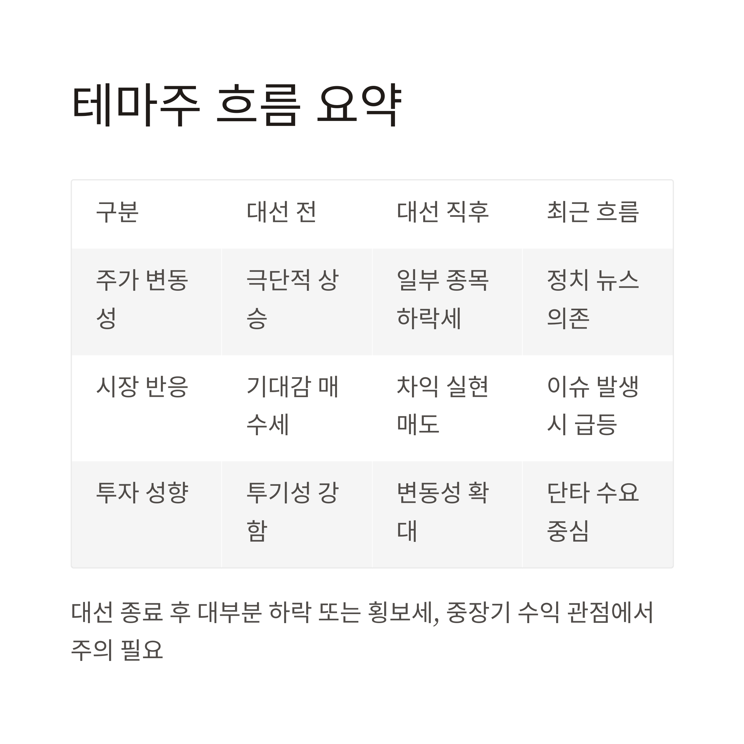정치 테마주는 타이밍 게임에 가깝고, 결국 실적이 뒷받침되지 않으면 추세를 유지하기 어렵다는 점을 명심해야 합니다.