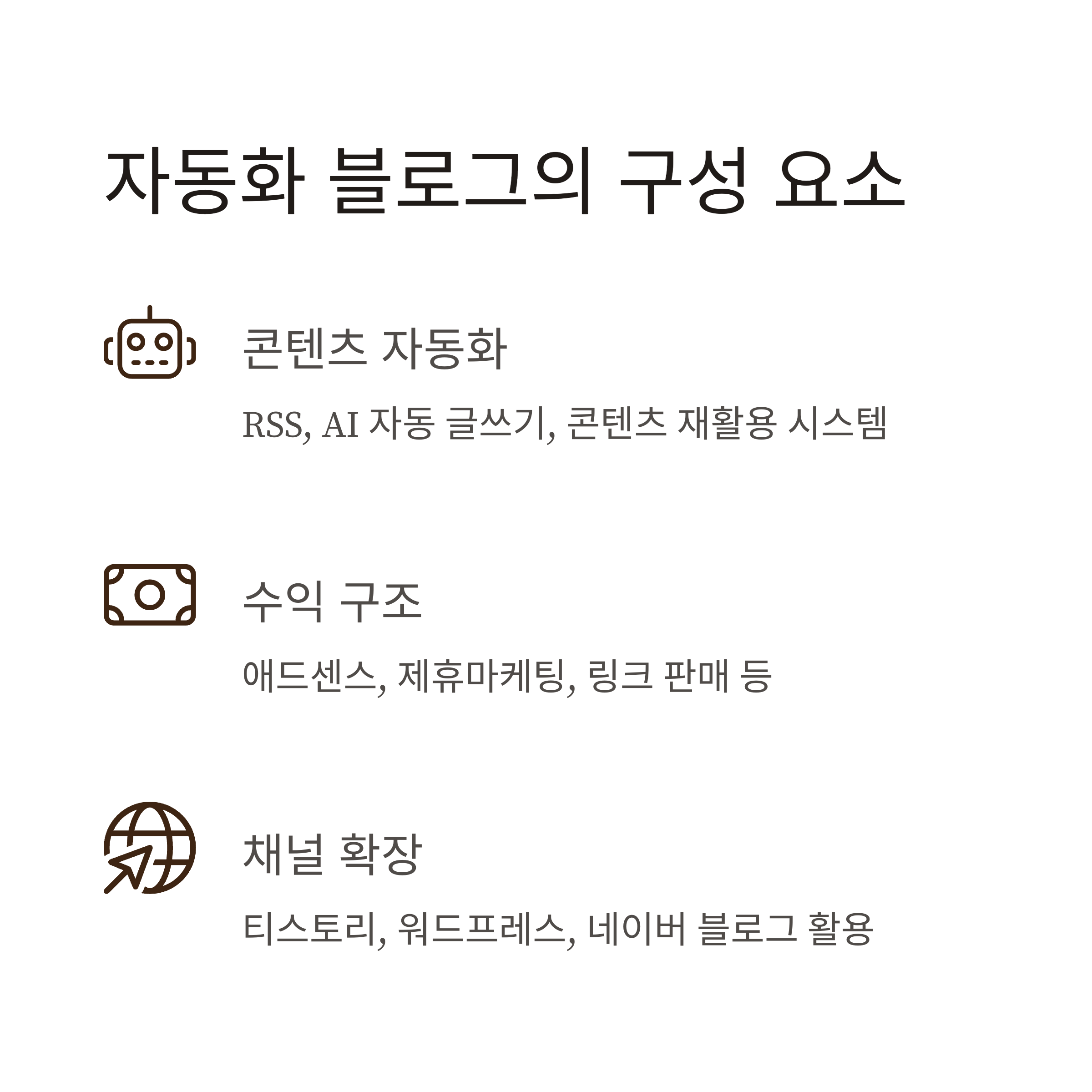 자동화된 블로그에서도 수익을 만들 수 있는 대표적인 구조는 다음과 같습니다.