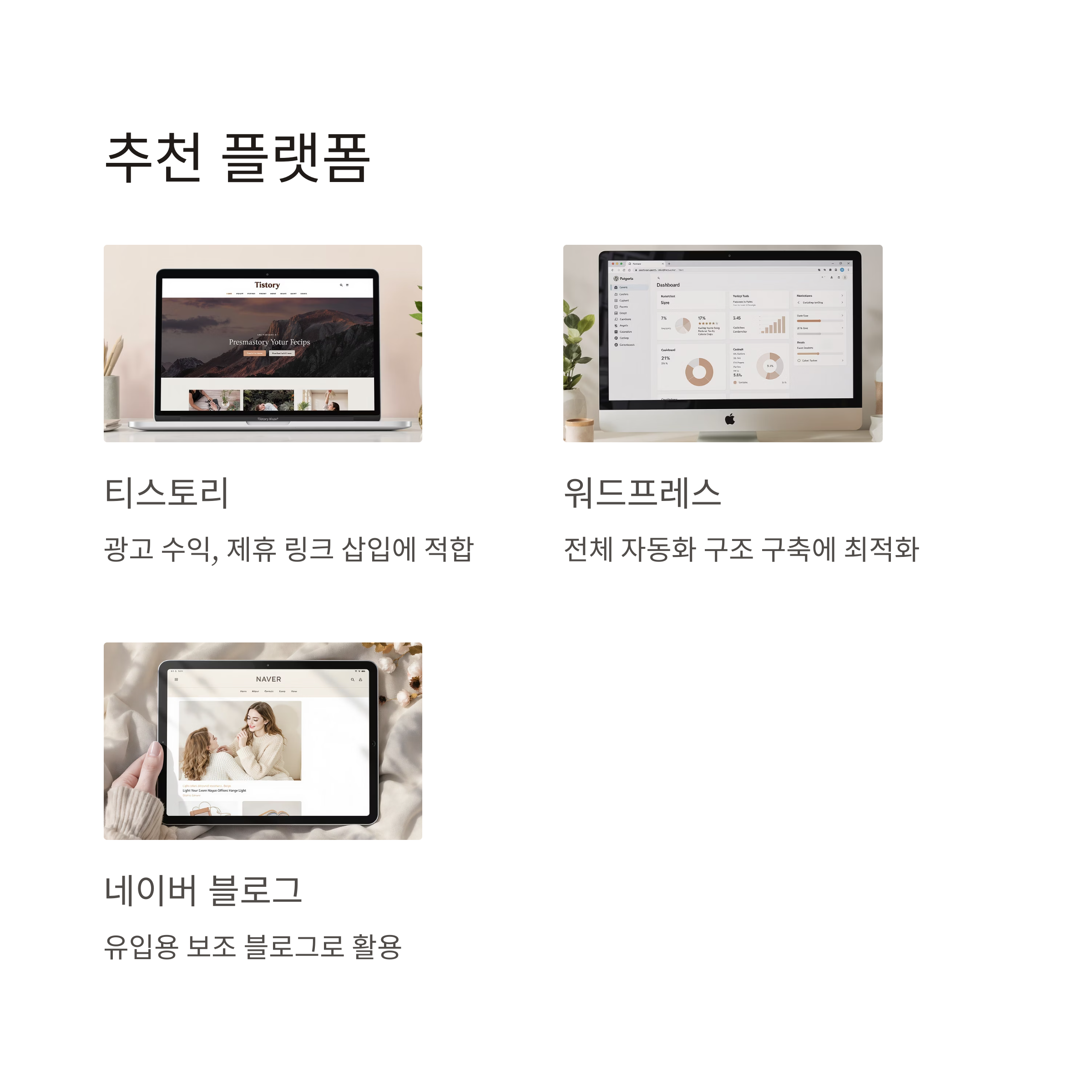 | 네이버 블로그 | △ (파트너스 한정) | 낮음 | 유입용 보조 블로그 |
