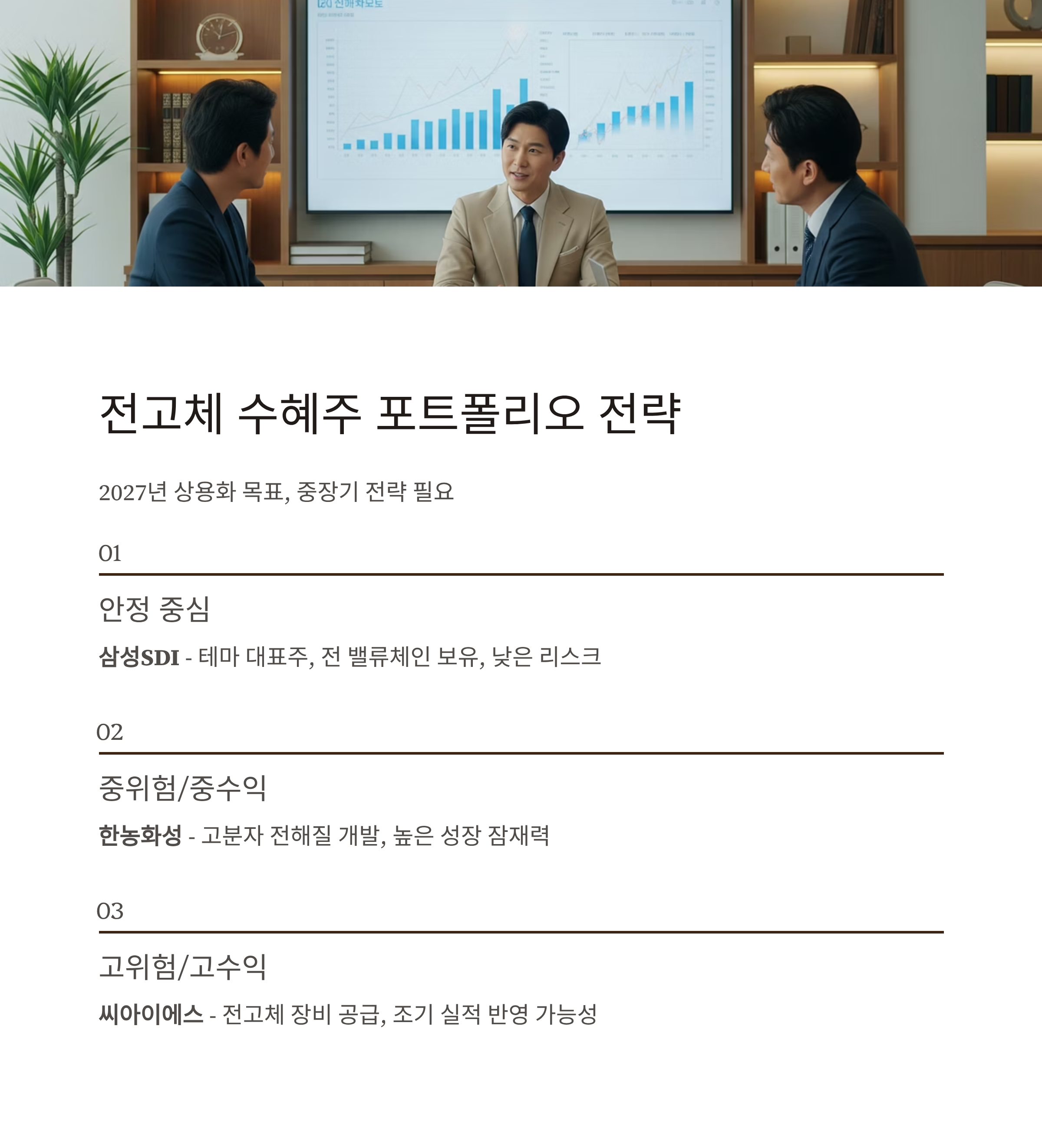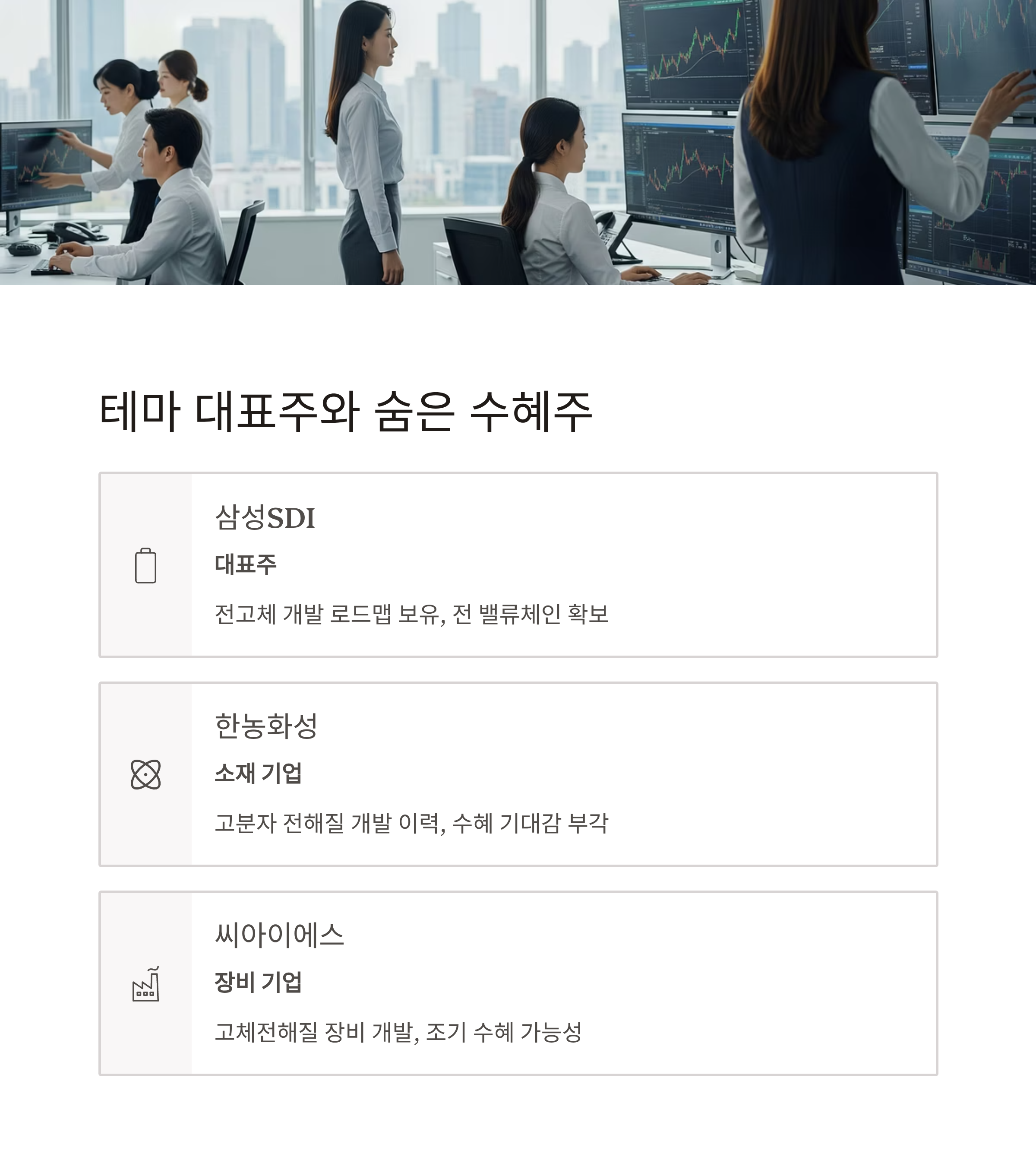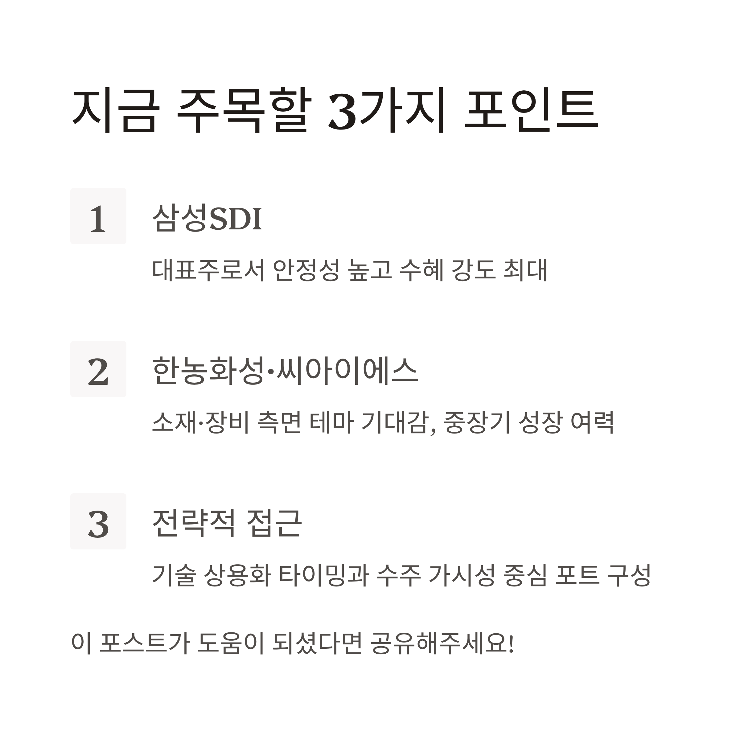 | 안정 중심 | 삼성SDI | 테마 대표주, 전 밸류체인 보유, 비교적 낮은 리스크 |