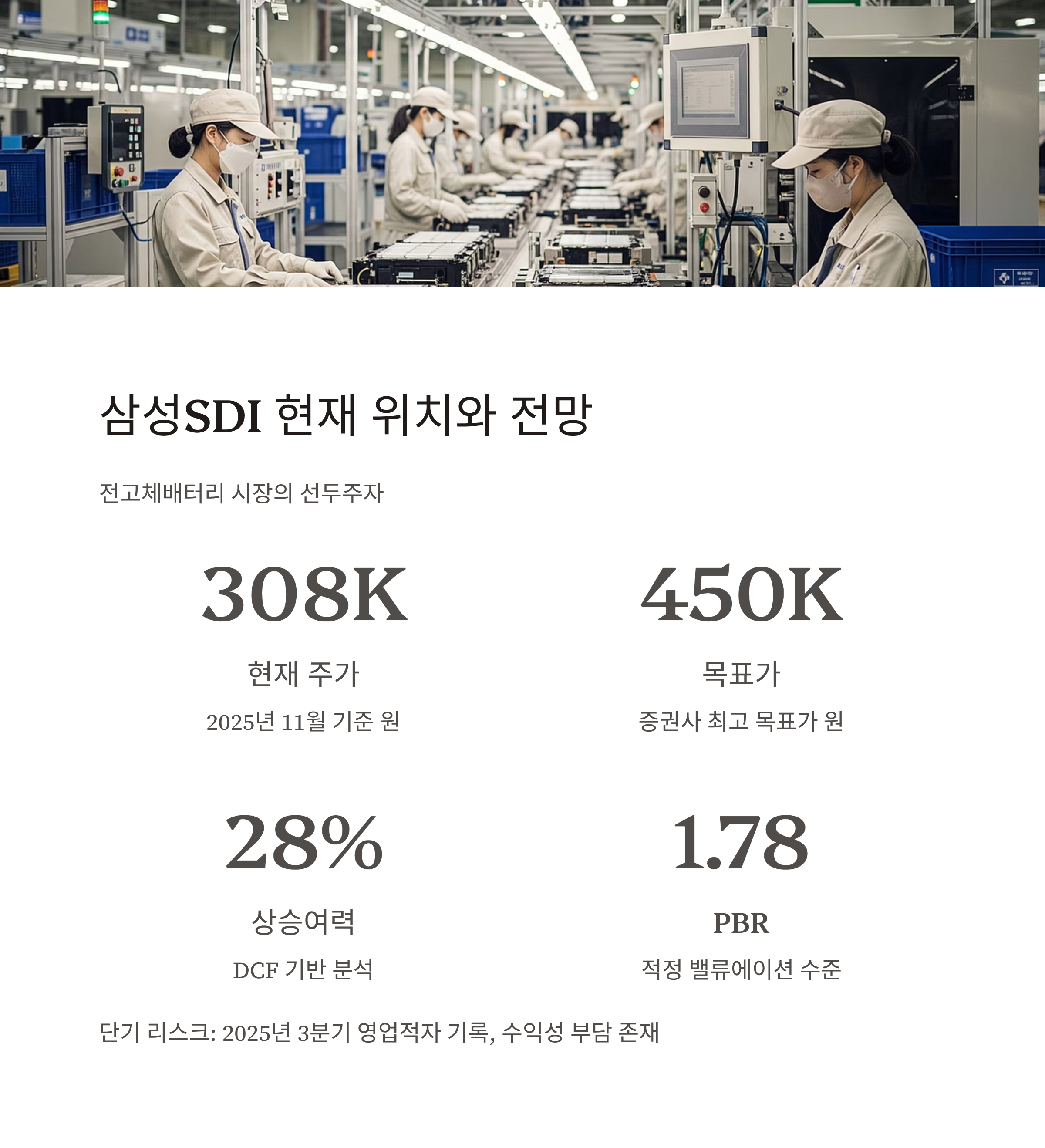 2025년 11월 현재, 삼성SDI의 주가는 약 308,000원 수준으로, 주요 증권사 목표가는 370,000원~450,000원 사이에 형성되어 있습니다. DCF 기반 분석에서는 약 28% 상승여력이 존재하며, 밸류에이션도 PBR 기준 1.78배 수준으로 무리 없는 편입니다.