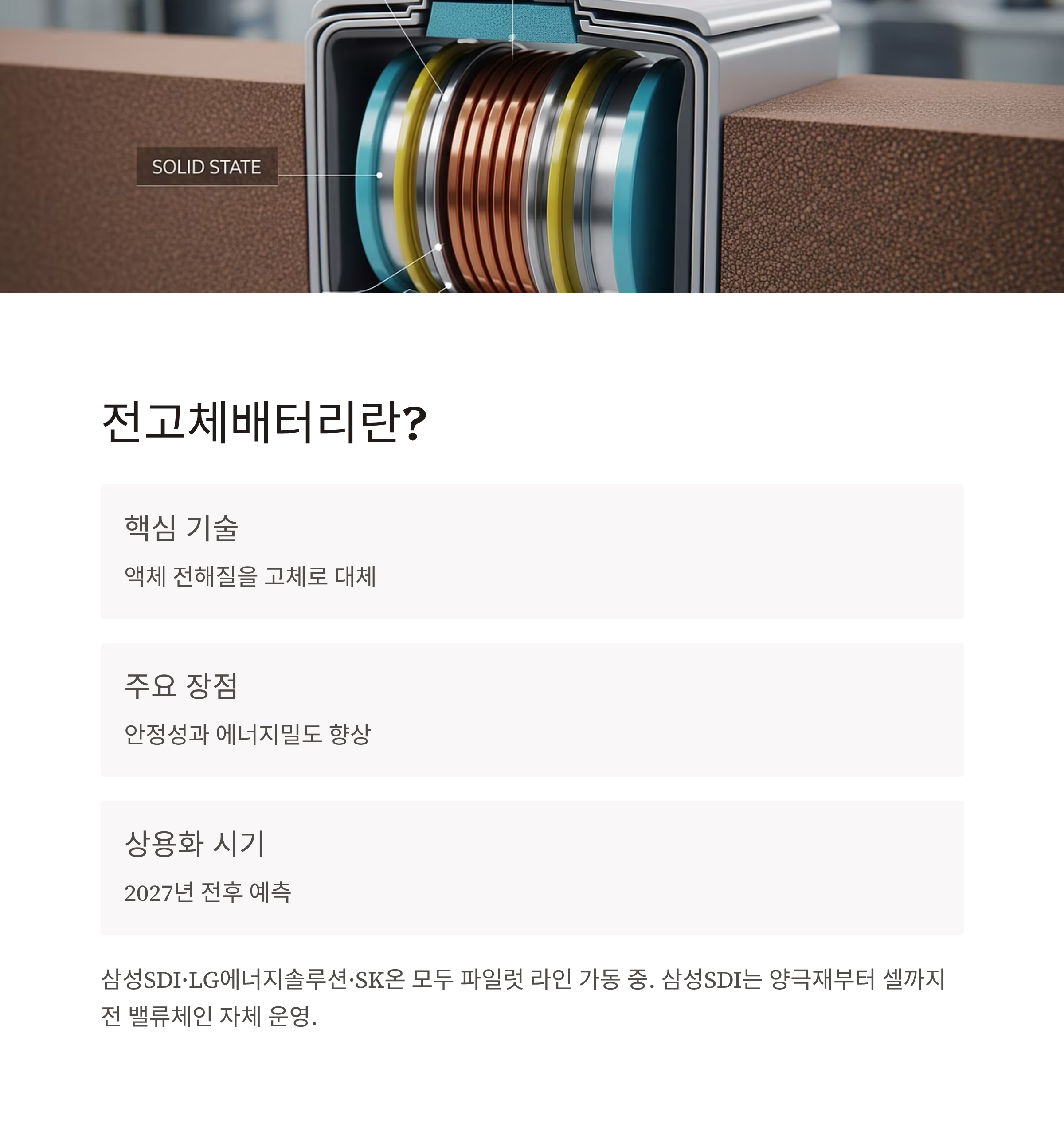 기존 리튬이온배터리의 액체 전해질을 고체로 대체한 기술로, 안정성과 에너지밀도에서 큰 장점을 갖습니다.