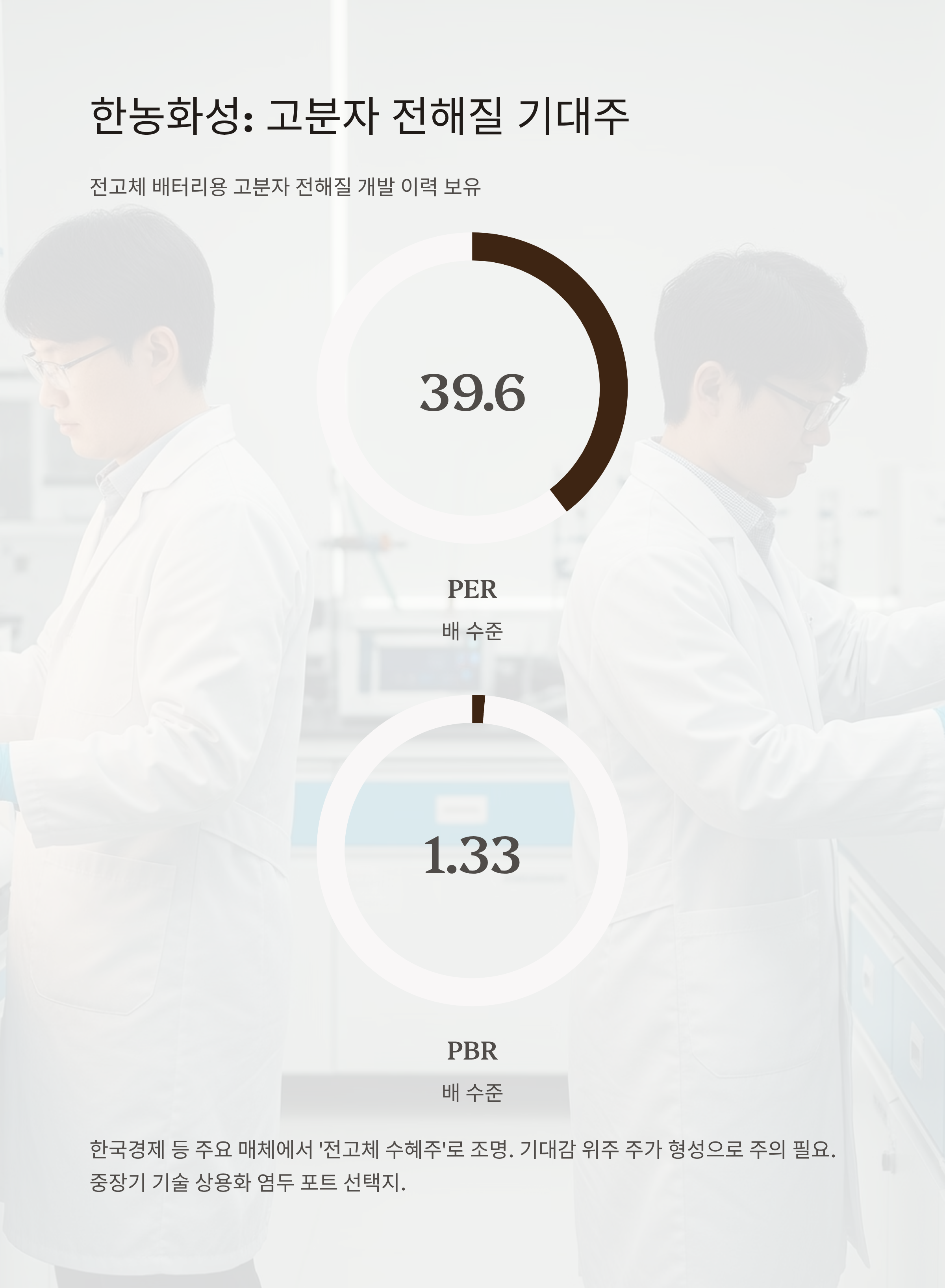 한농화성은 전고체 배터리용 고분자 전해질 개발 이력을 가지고 있으며, 관련 테마에 자주 언급되는 숨은 강자입니다.