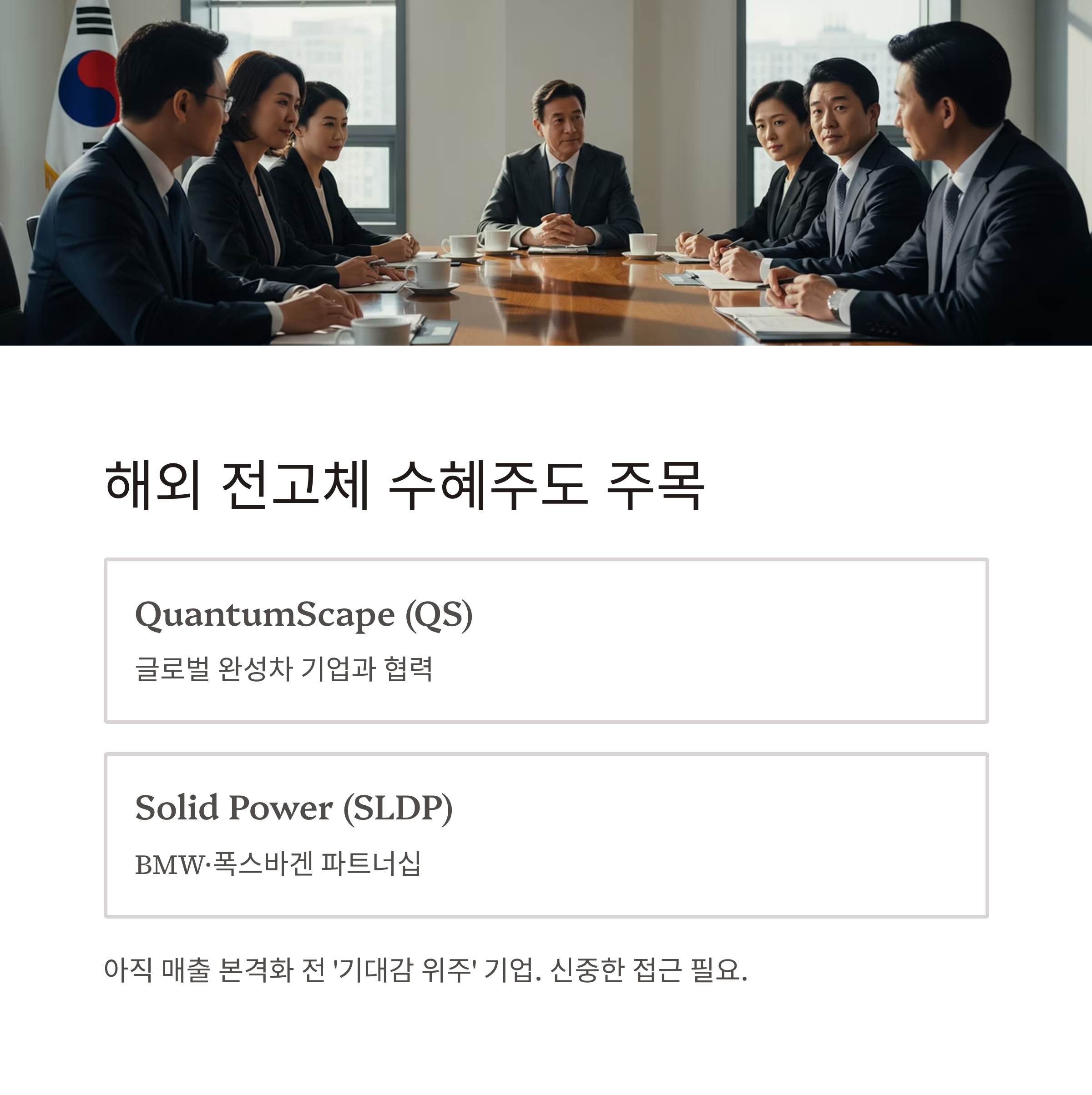 국내뿐 아니라 해외 기업 중에도 전고체 배터리 관련 숨은 수혜주들이 있습니다. 대표적으로 QuantumScape(QS), Solid Power(SLDP)가 있으며, BMW·폭스바겐 등 글로벌 완성차 기업과 협력하고 있다는 점에서 기대를 모읍니다.