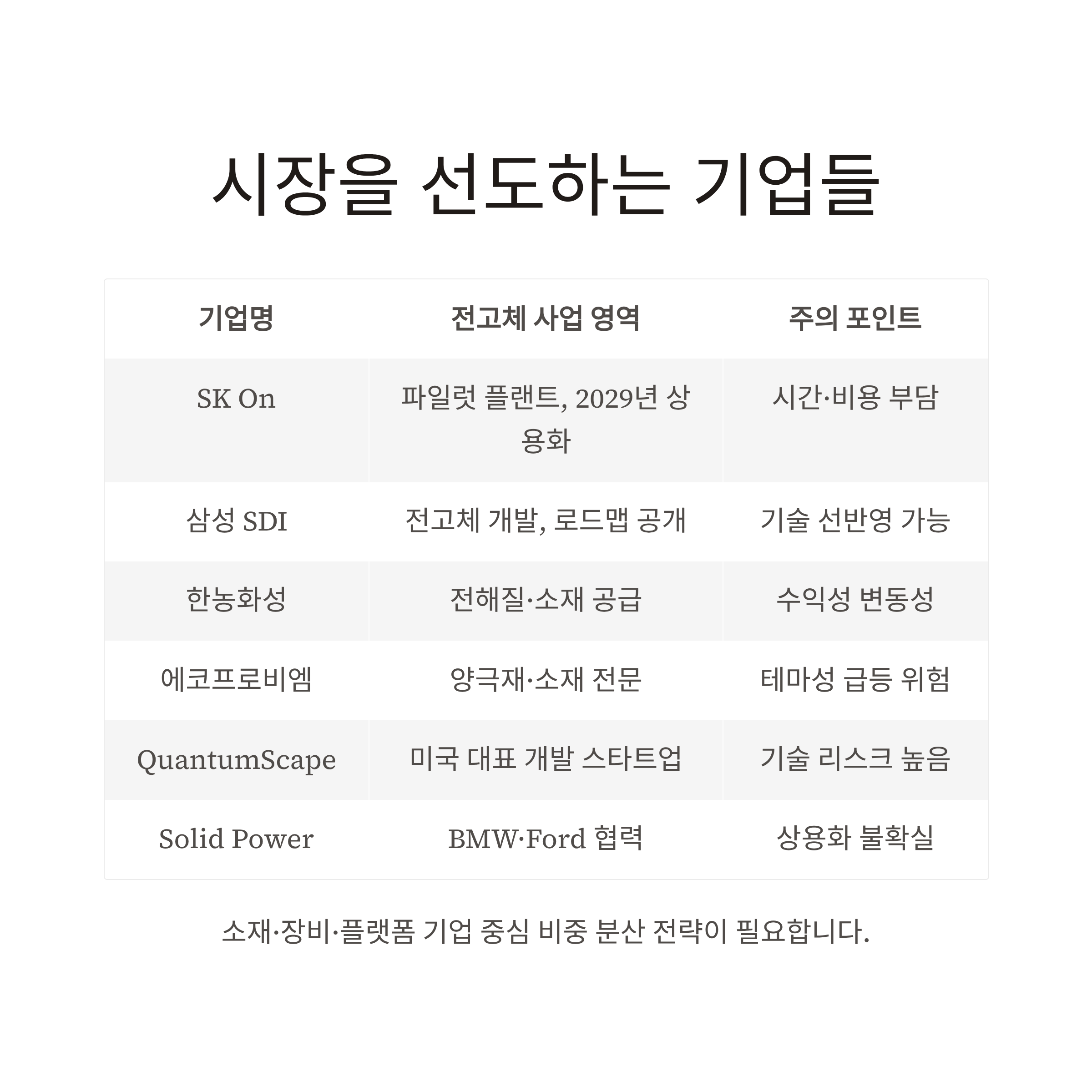 | 장기 (3년 이상) | 전고체 표준화 → 상용화 본격화 가능성 | 대형사 위주 비중 확대 + 플랫폼 기술 기업 주목 | 상용화 일정 불확실 + 공급과잉 가능성 |